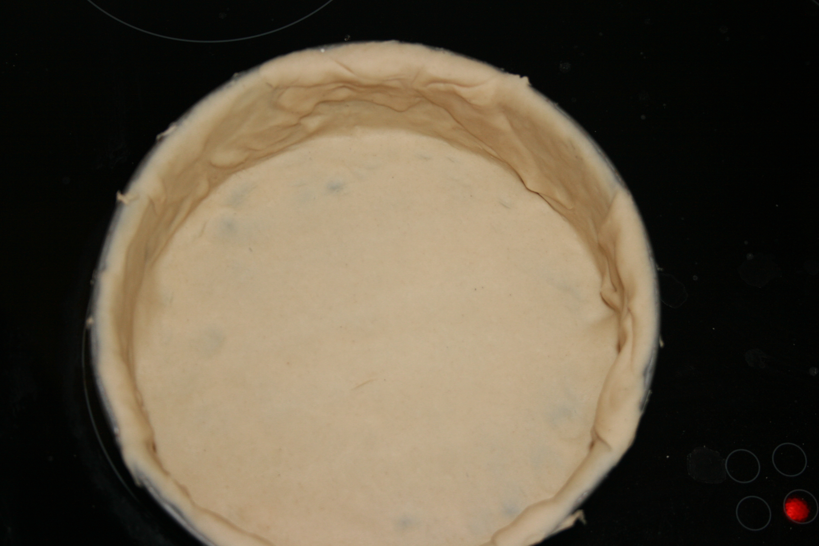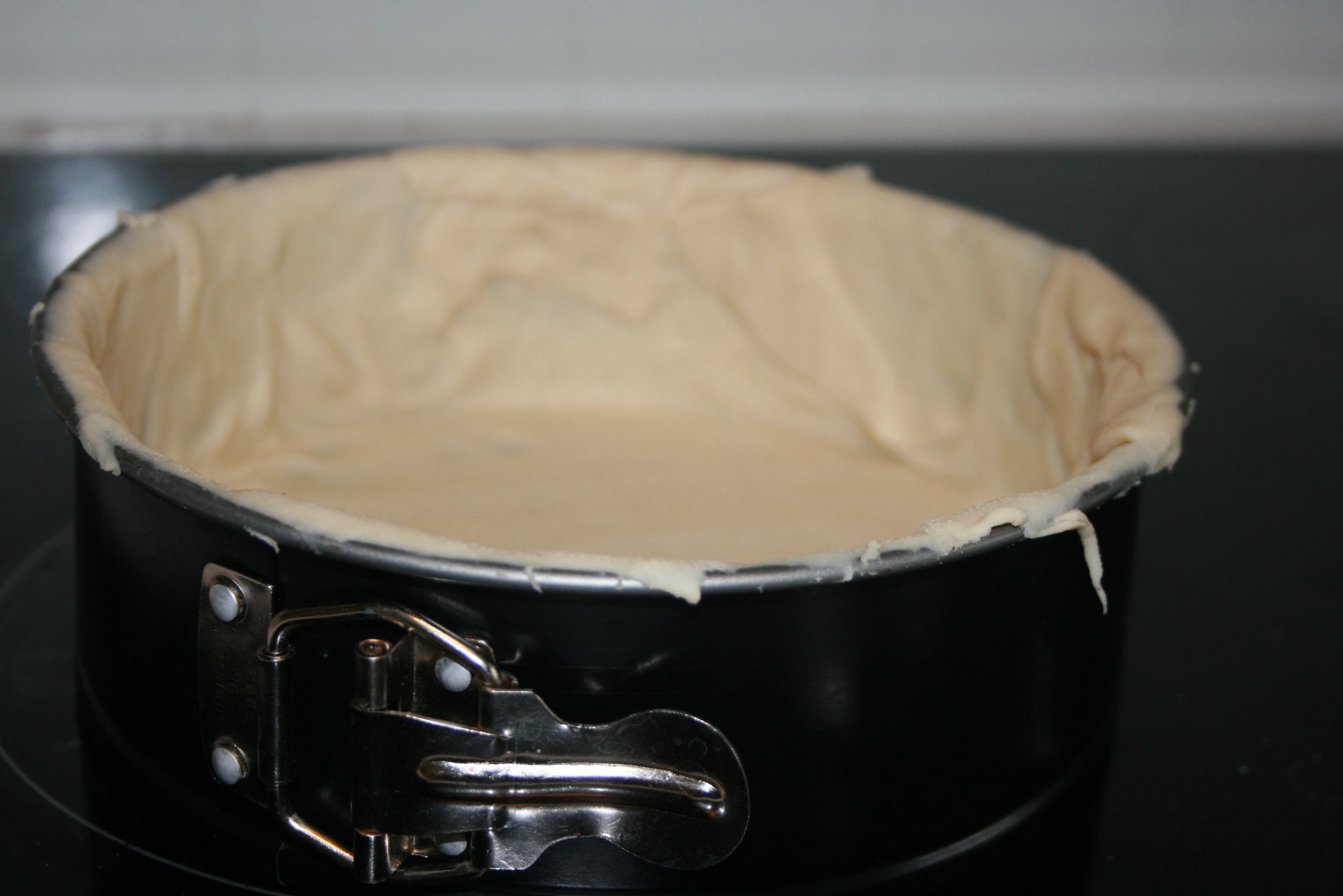 - Grease your springform pan with some butter. And spread your short crust pastry in the springform.