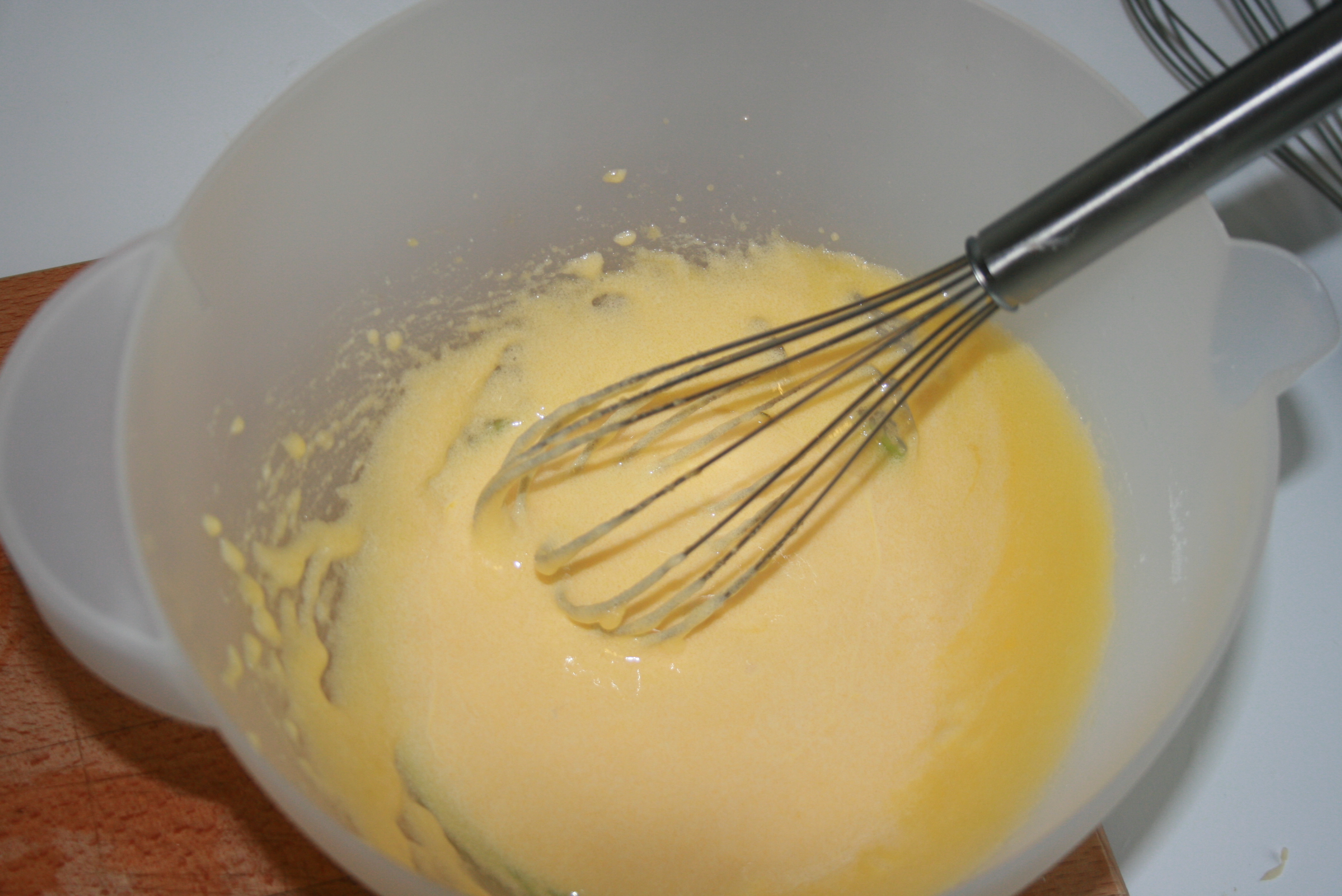 - Split the eggs (put egg yolk and white in a separate bowl). Add the sugar to the egg yolks and mix until it gets a creamy look.
