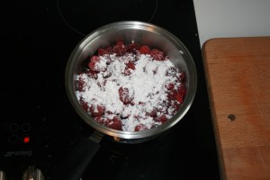 - For the dressing you take the remaining amount of Raspberries and put them in a cooking pot and add the powdered sugar (I always also add a sprinkle of water) and let it simmer on a low fire for about 15-20 min. and it is up to you if you prefer it like that or if you want to sieve it (zeven).