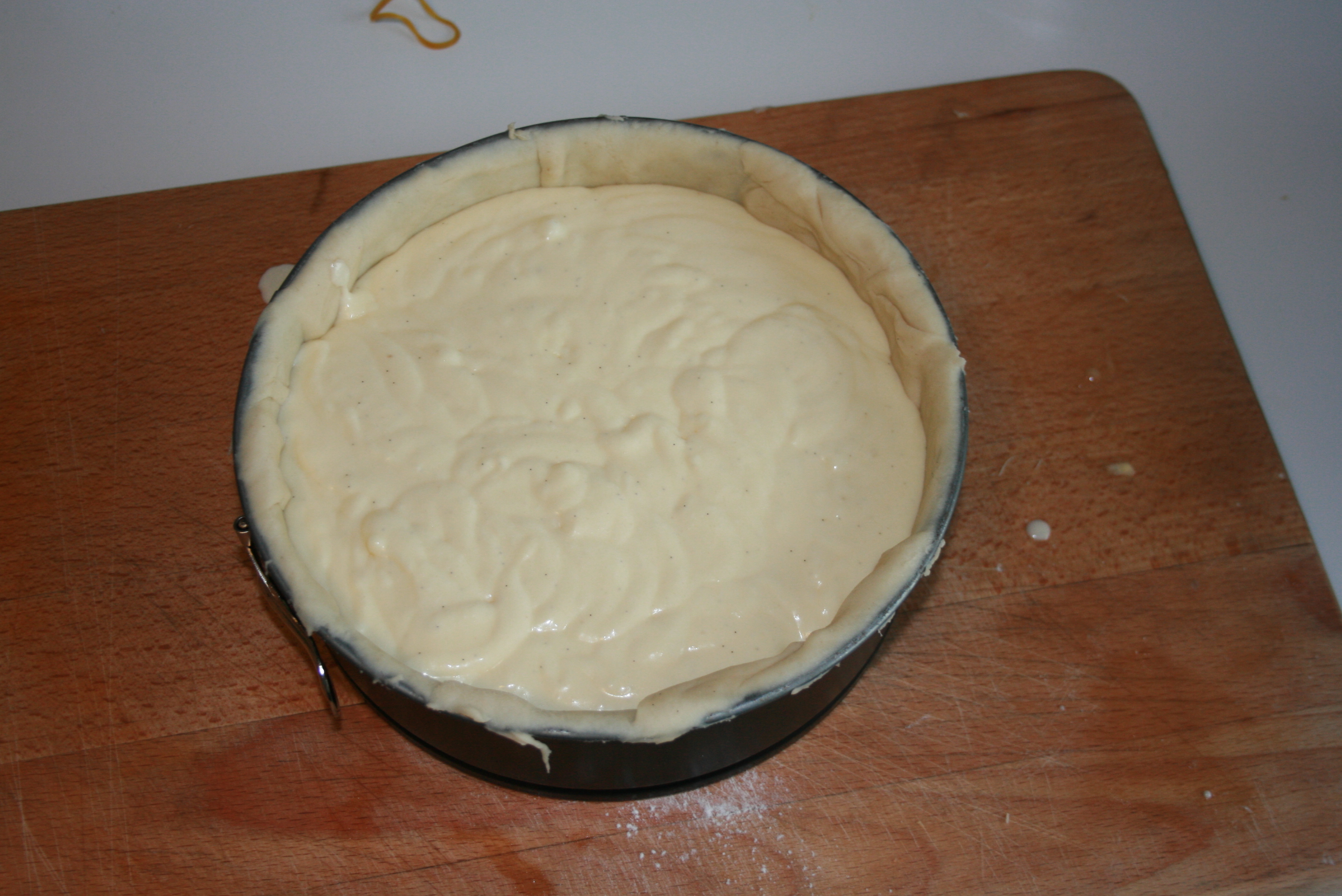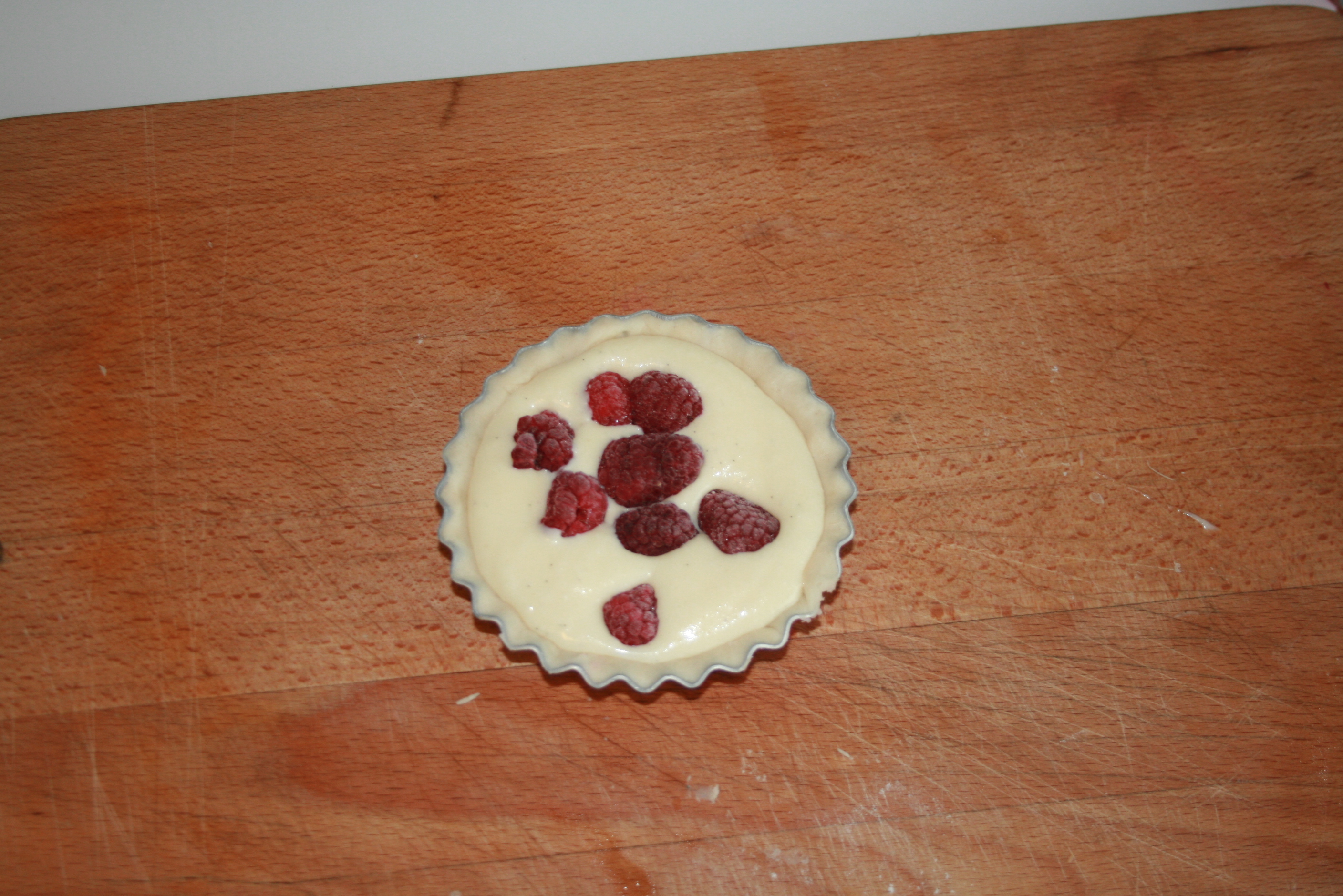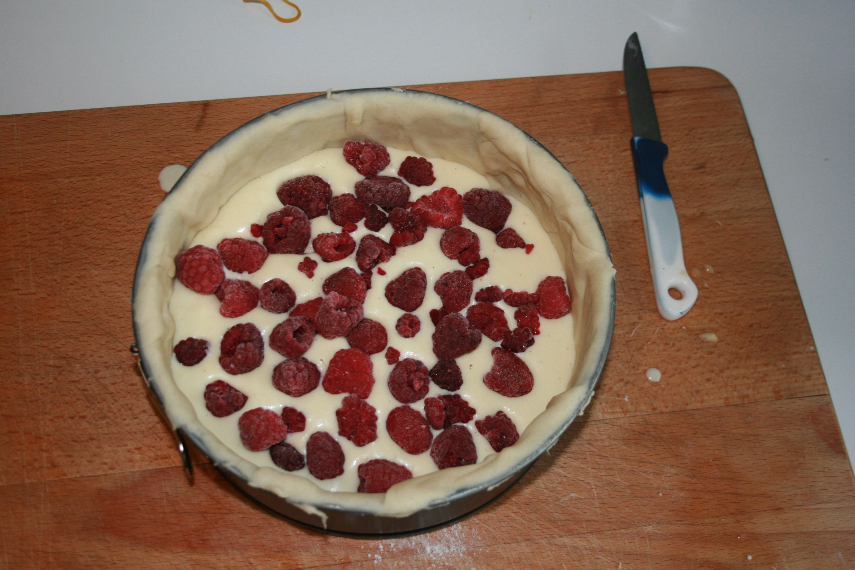 - Put some of the mix in the already prepared springform. Put 140g of the raspberries on top. Put again some of the eggs mix on top. (it might be that you still have some mix left over, then you can just make a few extra small cheesecakes. I usually do this for my girlfriend as she is a big fan of cheesecakes)