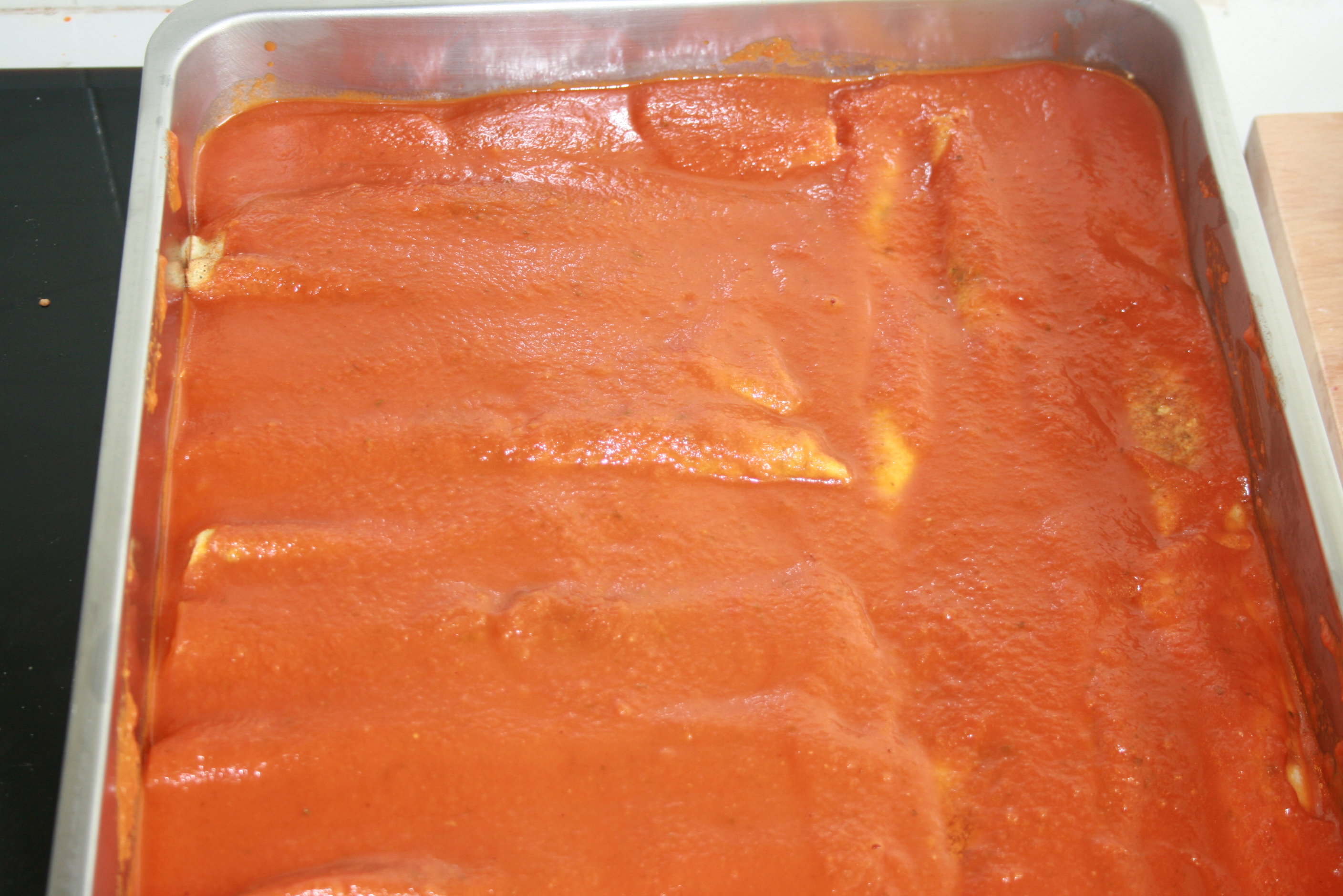 - Roll up the pancake and put on a backing tray. First put some of the tomato sauce on the bottom of the tray