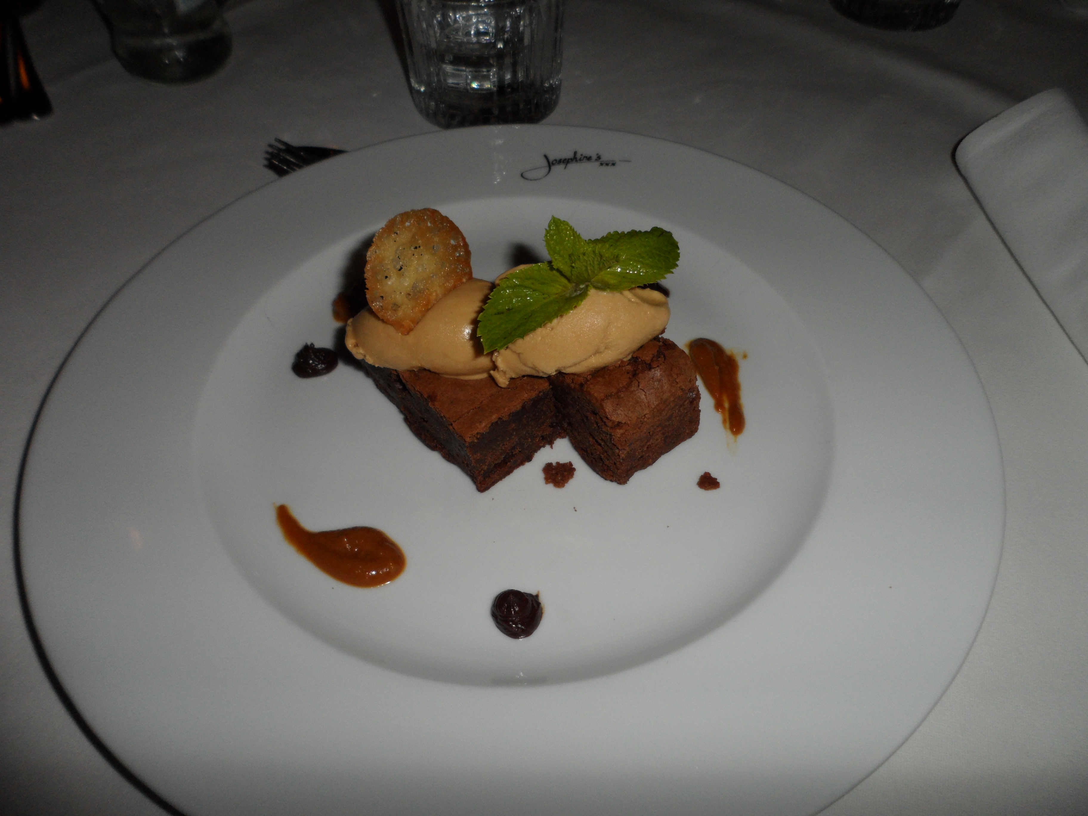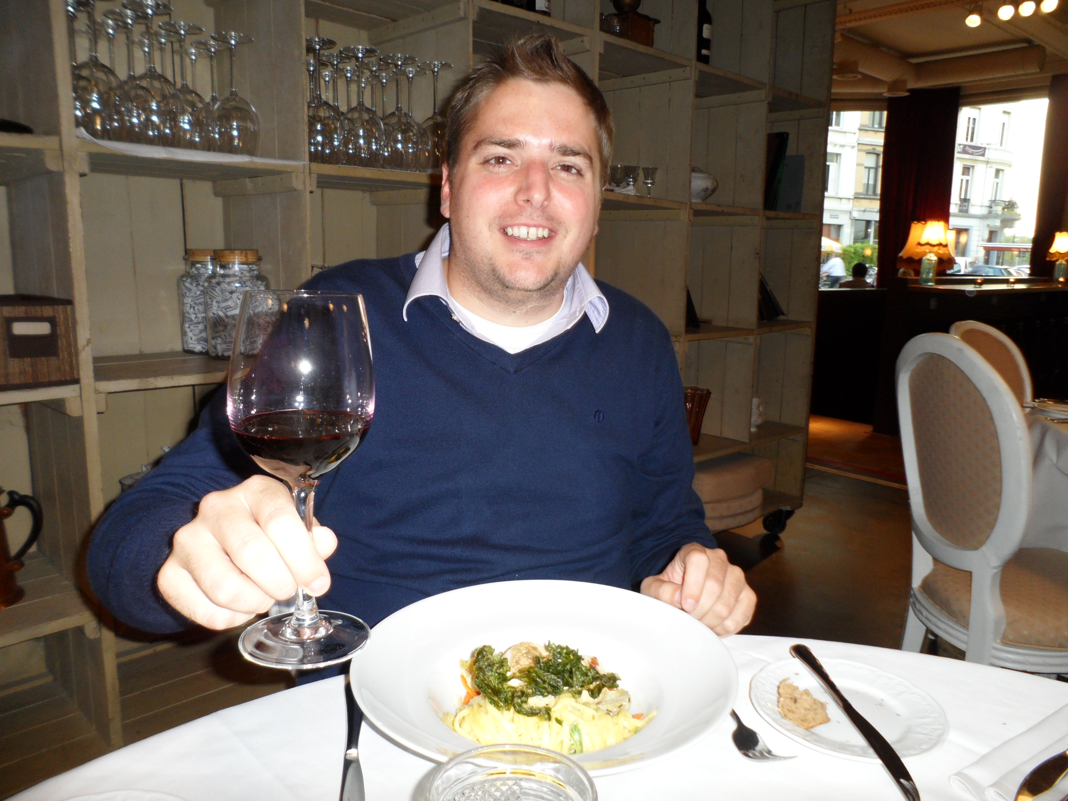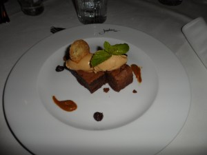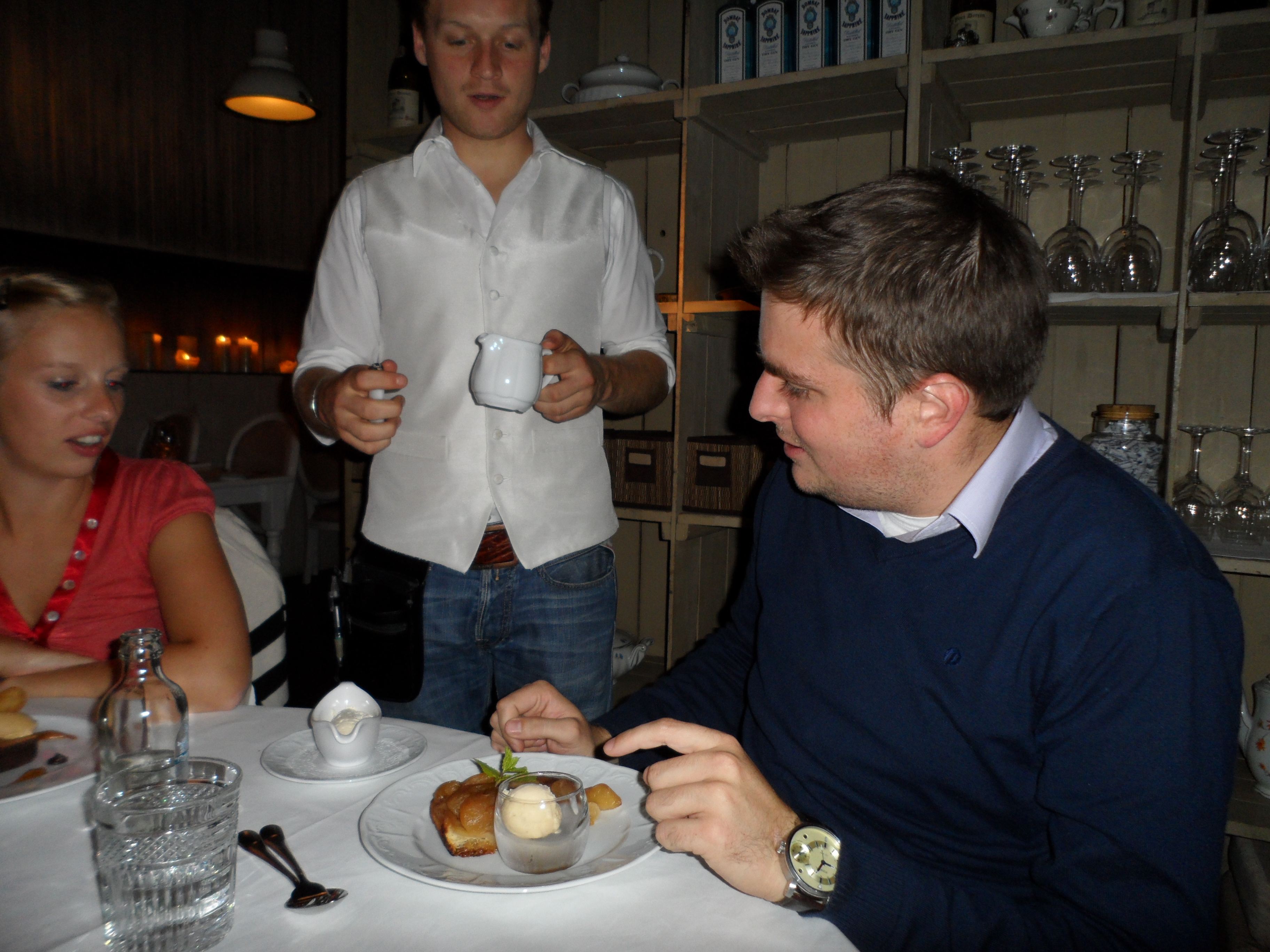 We also passed our orders in granny’s living room. 4 of us took the suggestions: Mechselse Koekoek (type of chicken) filled with Italian ham and zucchini, fresh linguini and oregano sauce (gravy sauce) and this was also what I took. The others took the Yellow fin tuna with green asparagus, shiitakes and mashes potatoes with a butter/spring onion sauce. One of my colleagues chose the trademark dish of the restaurant called “Black angus”. We all took different wines to accompany our dishes. I took the Australian Shiraz that to my opinion nicely matched the dish. We all enjoyed our meals and I really like it when I have a full taste while eating (for example if a gravy didn’t cook enough it would be tasteless). The tuna was also cooked as it should.