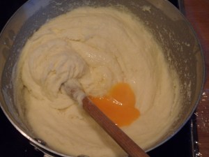 - Add the egg yolks one by one while stirring