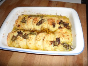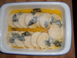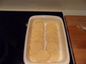 - Put the little rounds in a baking dish that you greased with some butter.