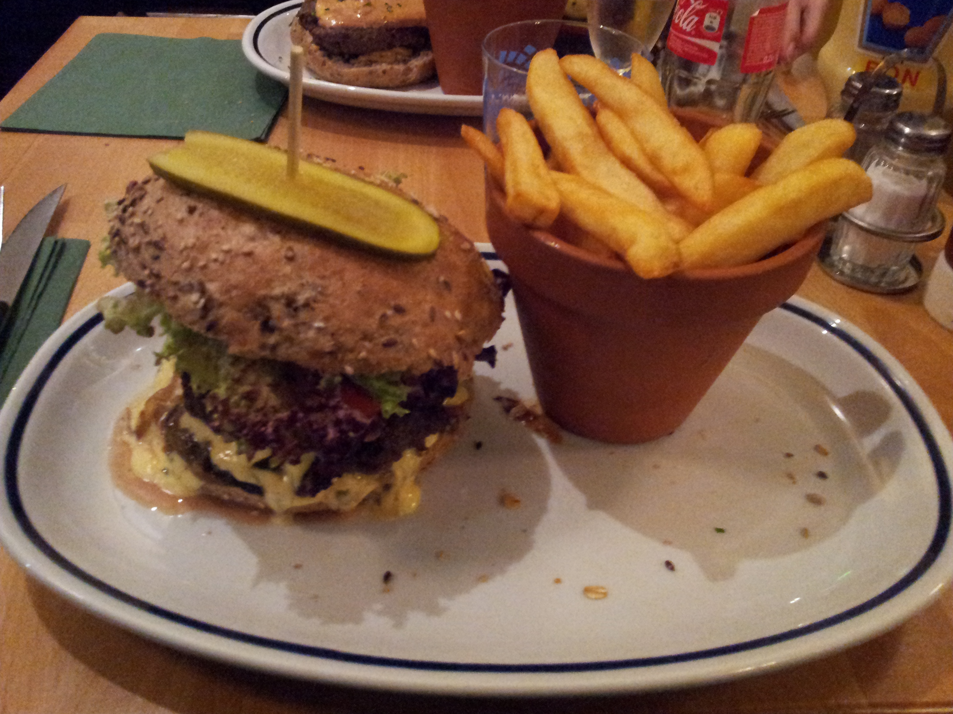 Anyhow, I didn’t come for the interior but for food! Houtsiplou is well known for being a family & child friendly restaurant (so I’m right at my place) and for its delicious hambugers. Also very good to know, vegetarians can also accompany their friends here, as all the burgers also get served with Tofu instead of meat and there are also lots of other veggie possibilities on the menu. We’re not veggie, so out with the tofu.