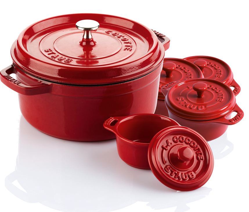 But they were not the only ones Staub also has done something special. For the moment they have a promotionset, this set consist 1 big cast iron pot of 24cm (3,8l) and 4 little ceramic cocottes of 10cm (0,2l)… they come in Black, Cherry, Griffith grey and blue. They usually are priced 219EUR, but NOW they are only 159EUR!!!! AND the best of it all is that if you receive this for Christmas, you can immediately use it for New Year’s eve.