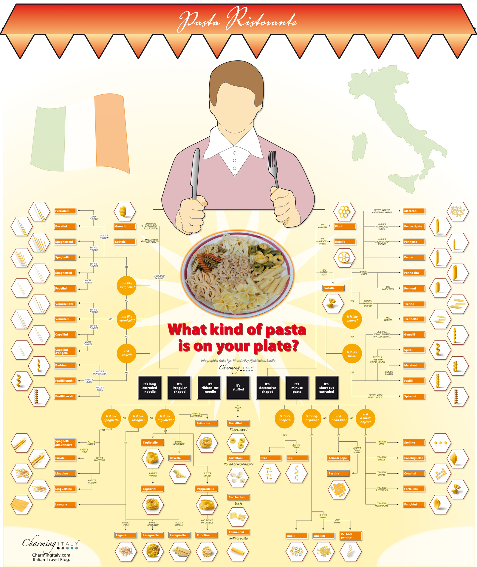 Last night I actually found a very nice infographic created by Charming Italy together with Barilla. They made a whole chart with all different kinds of pasta where you they help you to find to the right pasta, but also if you’re eating somewhere and wondering which pasta you’re eating, this chart will help you discovering which pasta it is.
