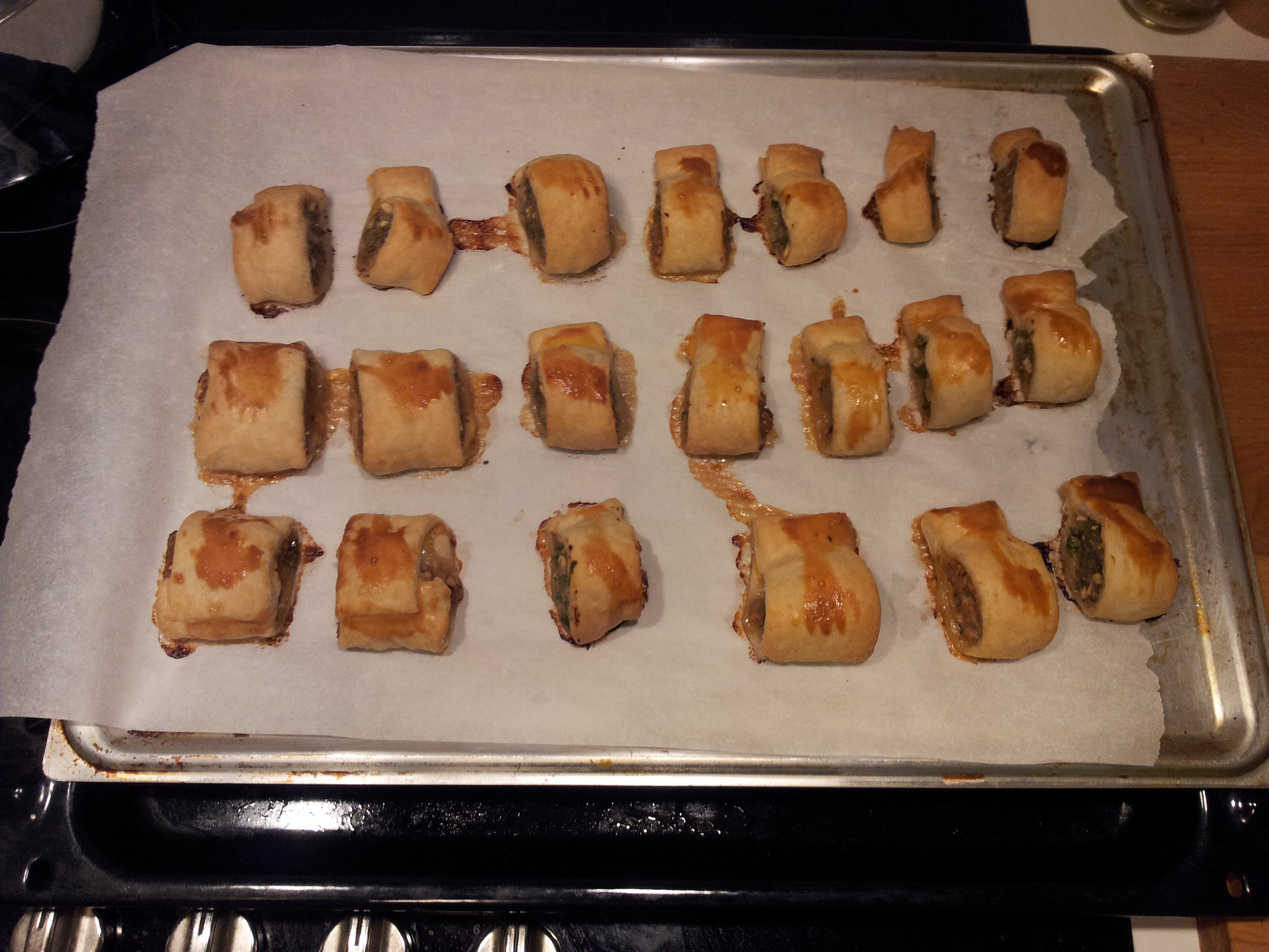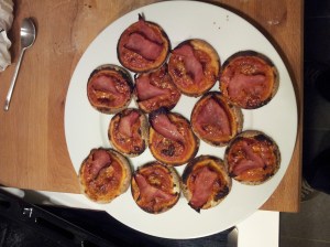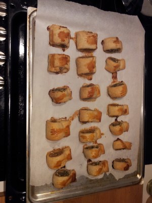 Last weekend for example as I appetizers I made mini vitello tonnato (the sauce is made in 2 minutes and the meat you just have to boil with few vegetables and some stock for a while and let it set for a night), mini pizza (from my recipe, but dividing the quantities by 2 or 3), some vegetables with cocktail sauce, mini ‘worstenbrood’ (puff pastry filled with minced meat) for this I got the recipe from the last Njam magazine (2 different kinds of stuffing, 1) minced meat, apples, parsley 2) minced meat, mushrooms, mustard and a little bit of basil (not in original recipe)) which took about 5 minutes to make…. so the last minute work took me about 10-15 minutes (not including the oven time, but not that I’m standing next to it the whole time…)