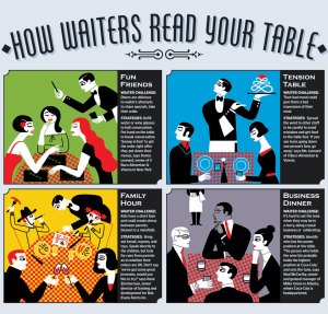 I read an interesting article in the Wall street Journal, it is about how waiters can read your table. Which isn’t an easy task, as within a few second a waiter has to figure out what the clients enter are expecting from the evening or what they want… All just to be able to provide the best service obviously. Having worked in my dad’s restaurant during a lot of weekends, I can tell for a fact that it is sometimes very difficult to know when somebody is ready to order. Normally when the menus are closed this would mean that they are indeed ready, but what to do if they didn’t even open it? You have to find ways to remind them they have to place their order… as otherwise no food. It has never happened that I talk soooo much (and I talk a lot) that I don’t want to order, for me that is usually priority nr 1 😉