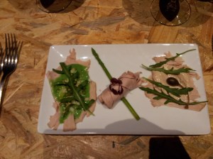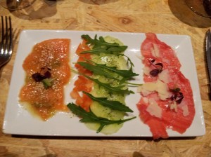 When we received our first course I have to say I was very pleased. As all the starters you could find on the menu were prepared in 3 ways, 1 traditional way and 2 more ‘experimental’ ways. I took the vitello (from the vitello tonnato) which had the traditional way, a lemon filling and a wasabi toping on the plate. My girlfriend ordered the carpaccio, with traditional carpaccio, veggie carpaccio with goat cheese and a salmon with special dressings. Again, I liked