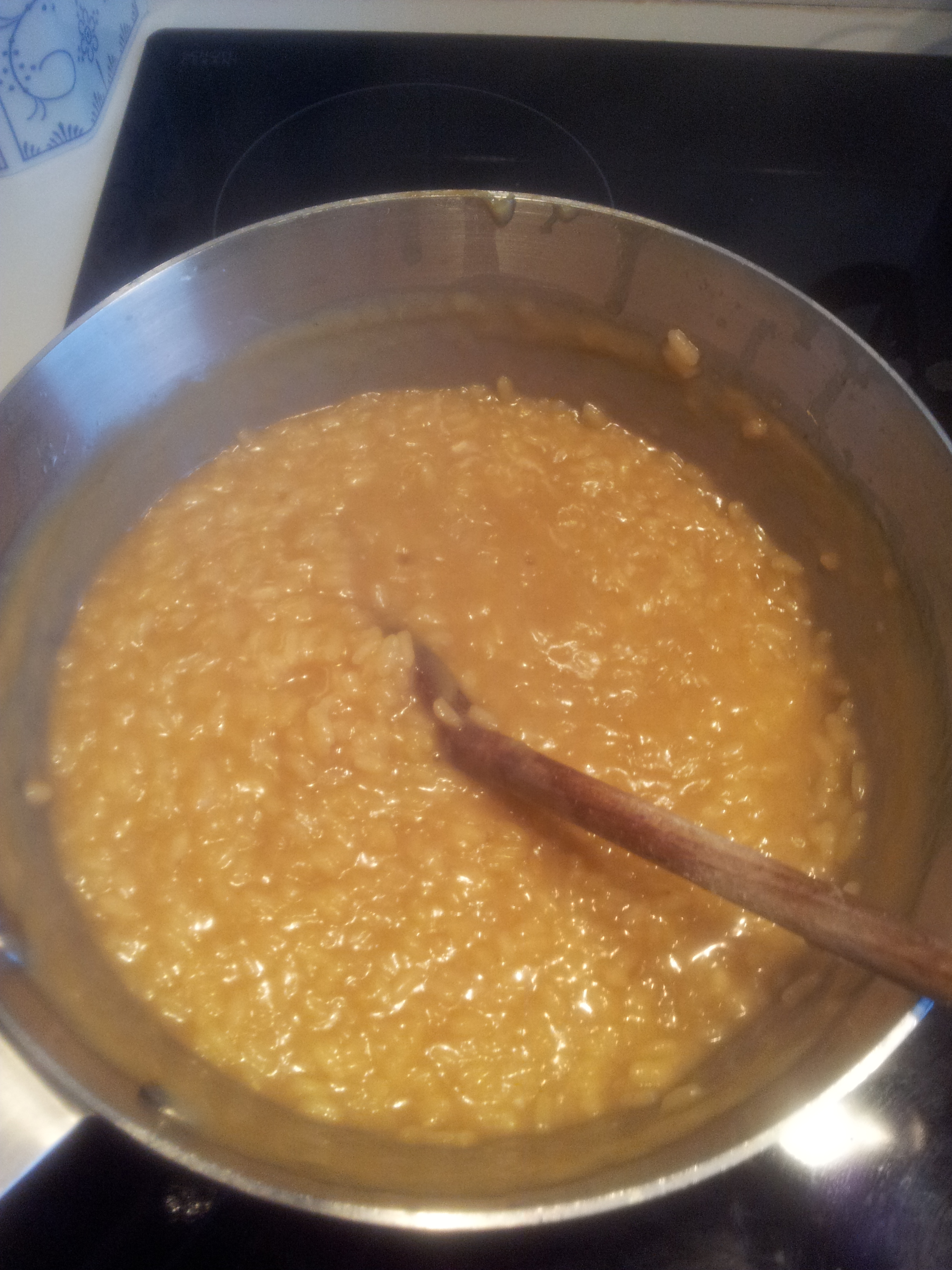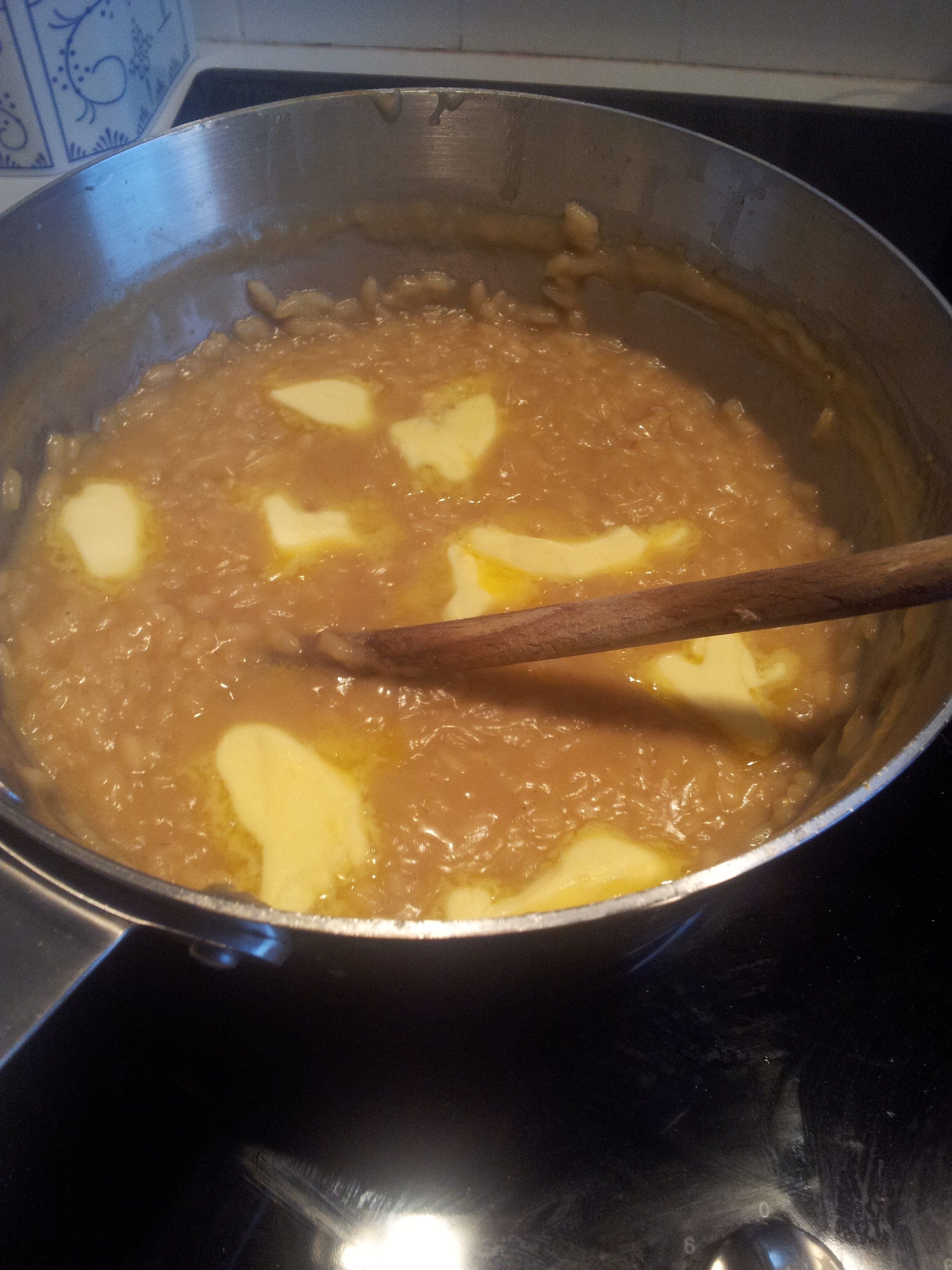 - From now you keep adding stock whenever you see the rice absorbed almost all the stock (1 or 2 spoons at a time) until your stock is finished. This will take about 25-35 minutes. It is important to keep stirring (not the whole time, but just every 2-3 minutes) to make sure the rice doesn’t stick to the bottom of your pot