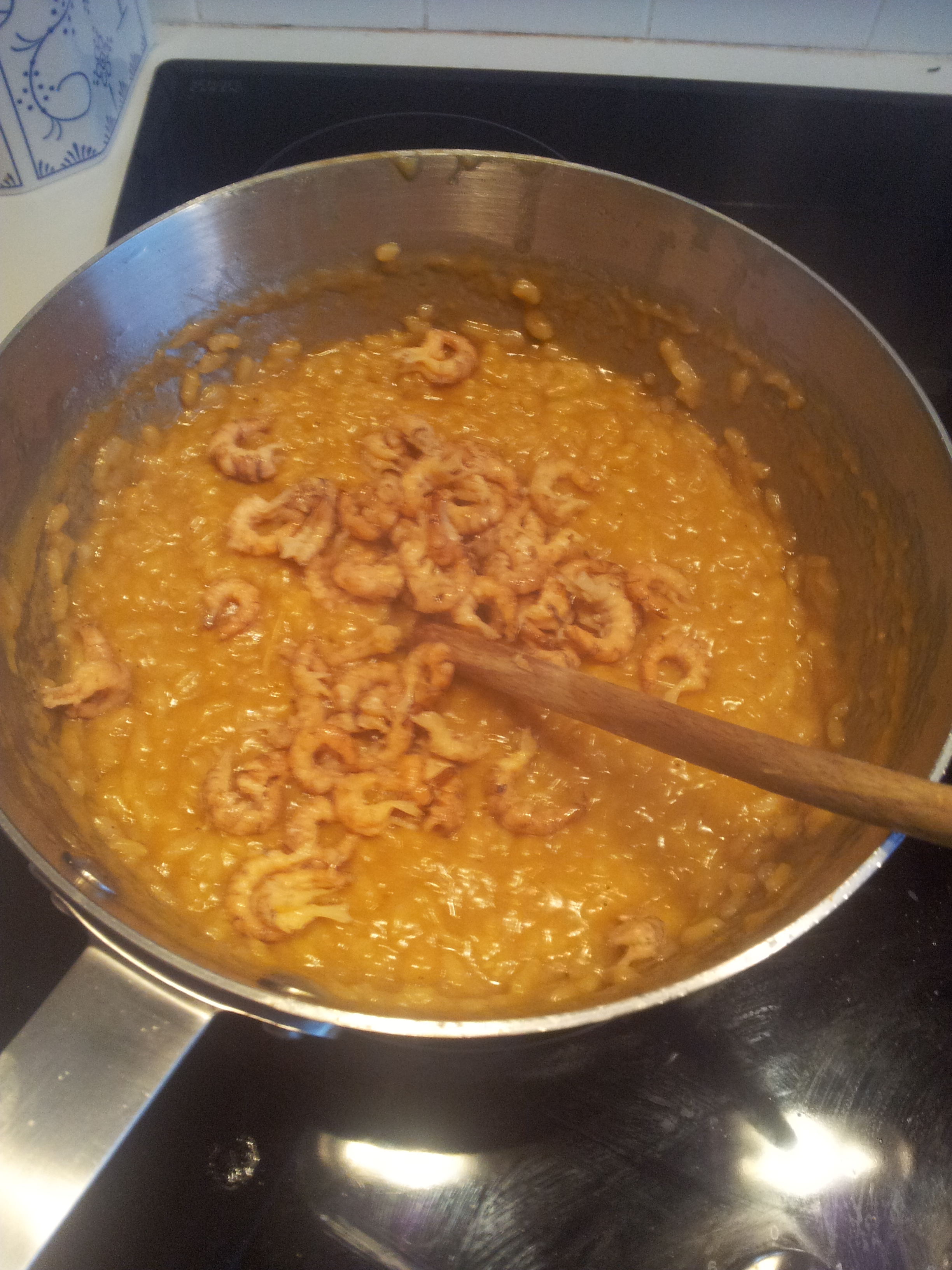 - Right at the end you can season with Pepper ( NO salt, as your stock is already salty. If somebody might want it saltier, they can add it afterwards). And add some shrimps (keep some for decorating your plate) and give a last good stir.