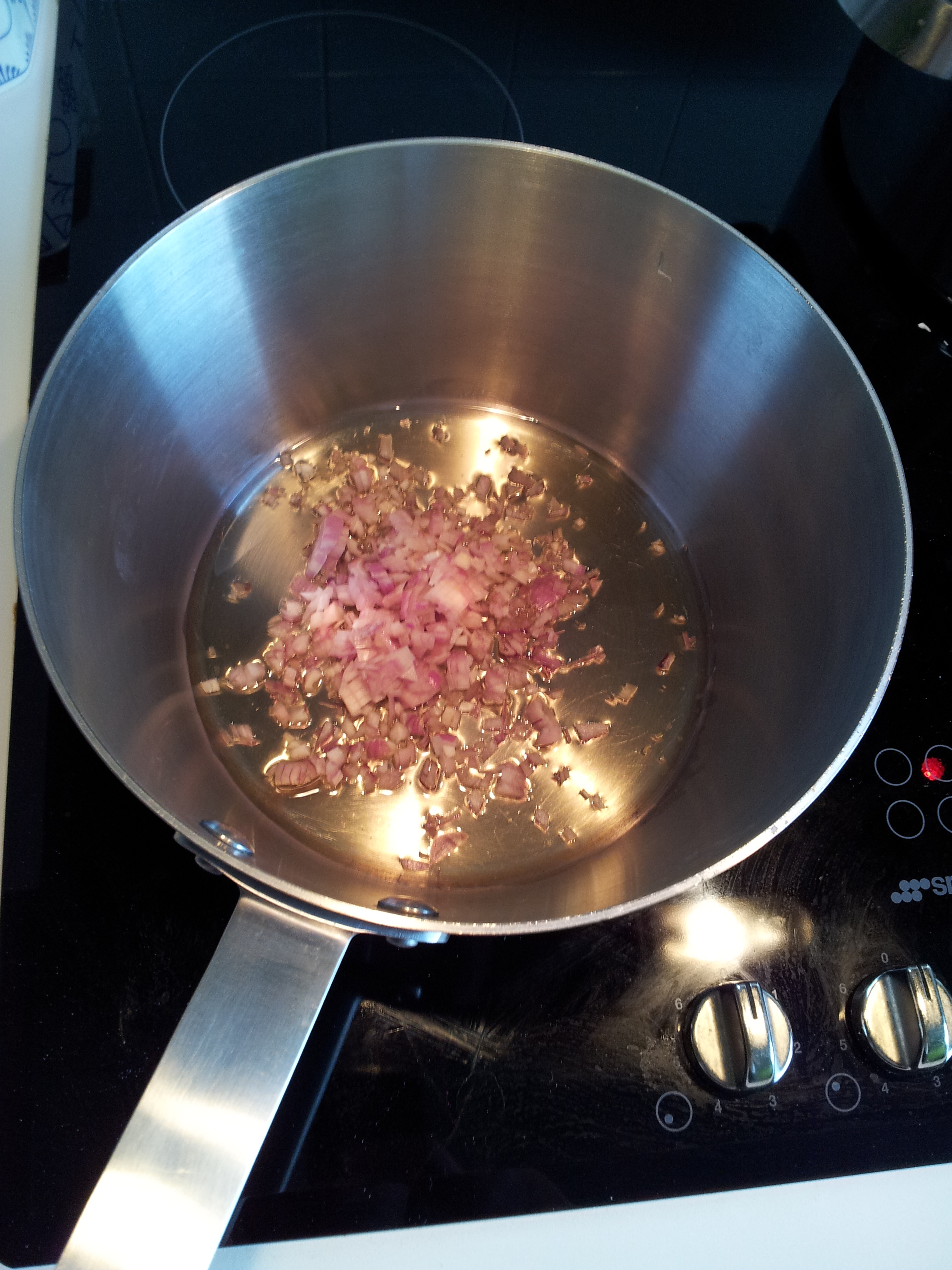 - Heat a pot with some olive oil and the shallot in it. Let it braise until you see the shallot starts to become a bit glassy