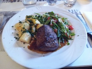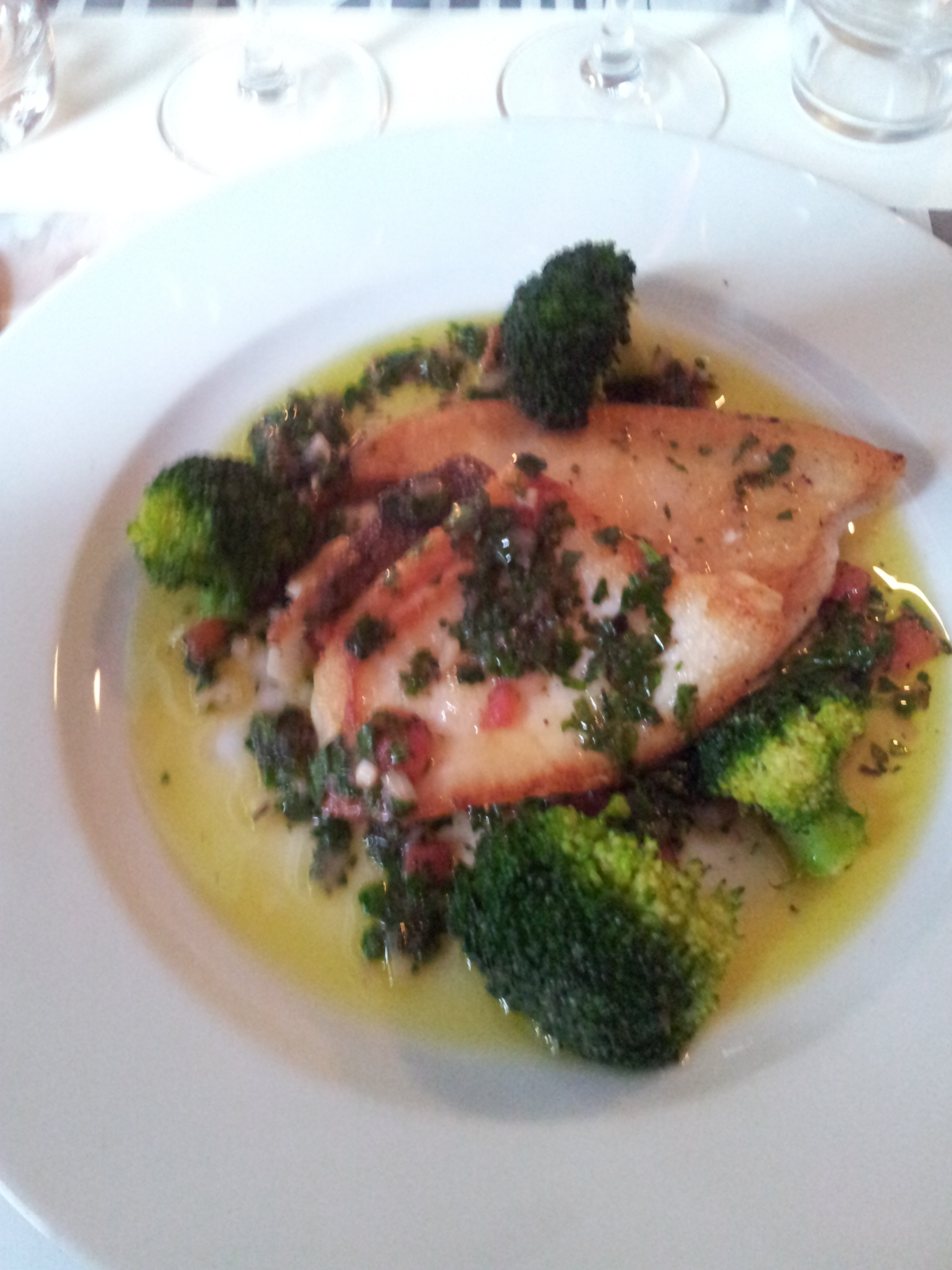 We went for the Black Angus with roquefort sauce (with the cheese, not the beer), Brill fish with sauce vierge and broccoli, veal steak with teriyaki and diced vegetables and quail with honey, ginger and chicory. To accompany this meal we drank a very tasty Spanish red wine