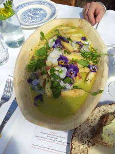 Food time, as that was the purpose of being here :-).  I can only say that one dishes was even better than the other one we started off with some white asparagus (the season has just started) with some dried meat (originating from Alken) with a walnut dressing and a salad of fresh herbs  (from the Mombeek valley) and some freshly made rye bread.  This got served with a Belgian chardonnay ‘blauw’ from Genoels-Elderen