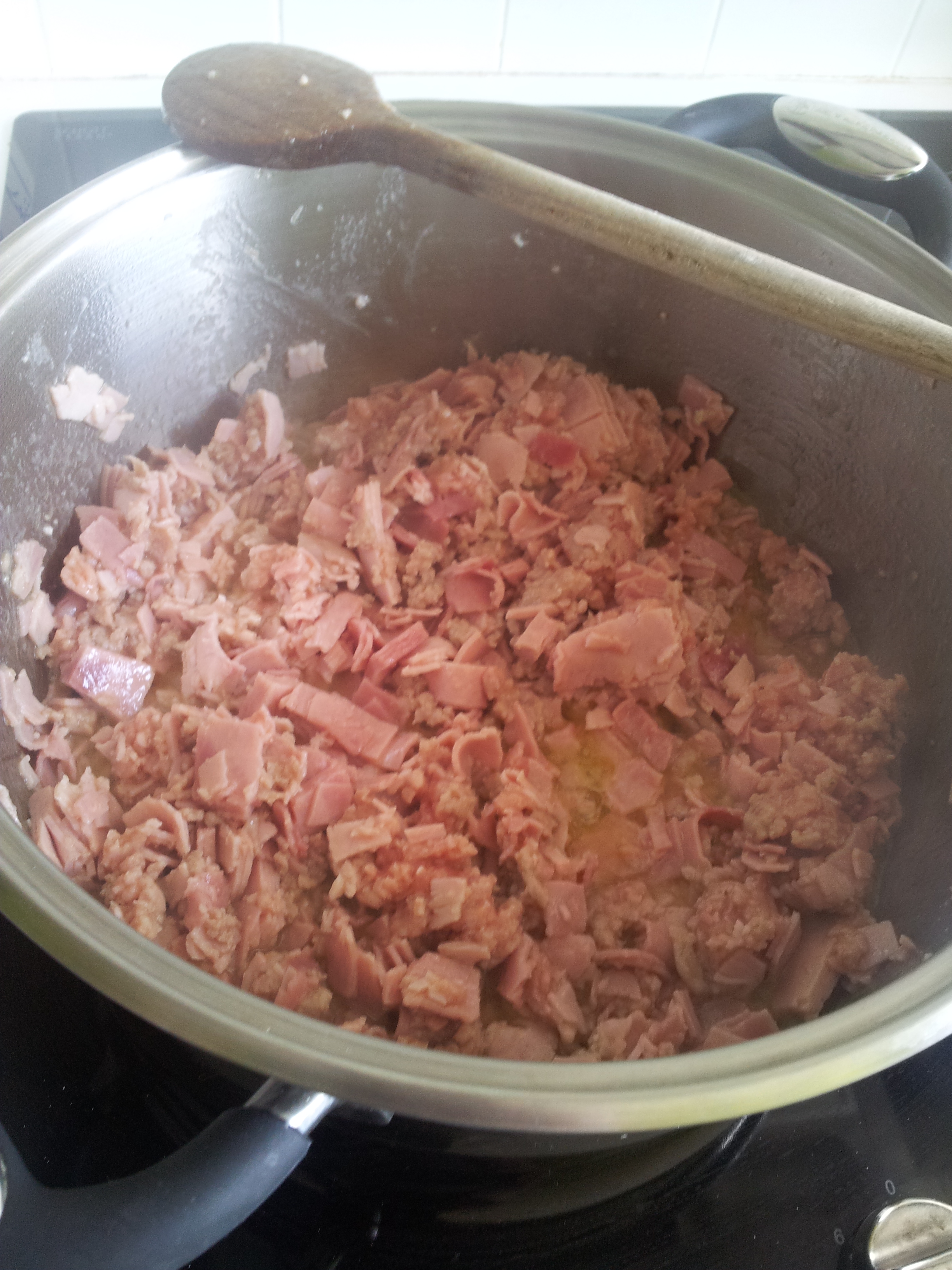 - Cute the ham in cubes and bake it together with the minced beef in the butter (yes, all the butter) for about 10 minutes.