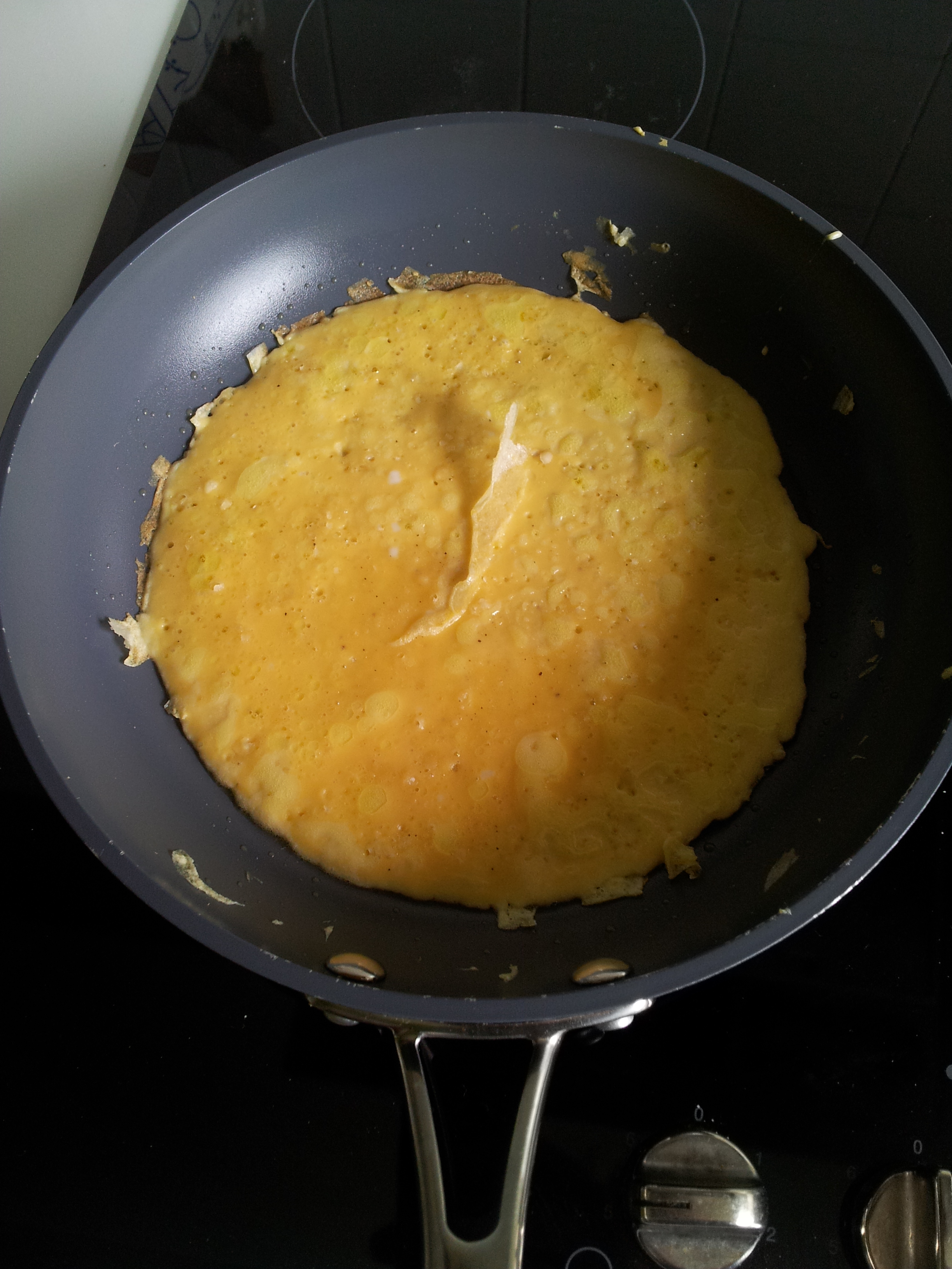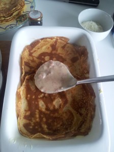 - Grease your oven tray and start making your lasagna. Layer 1 are the pancakes, followed by the sauce (if wanted with some parmesan)