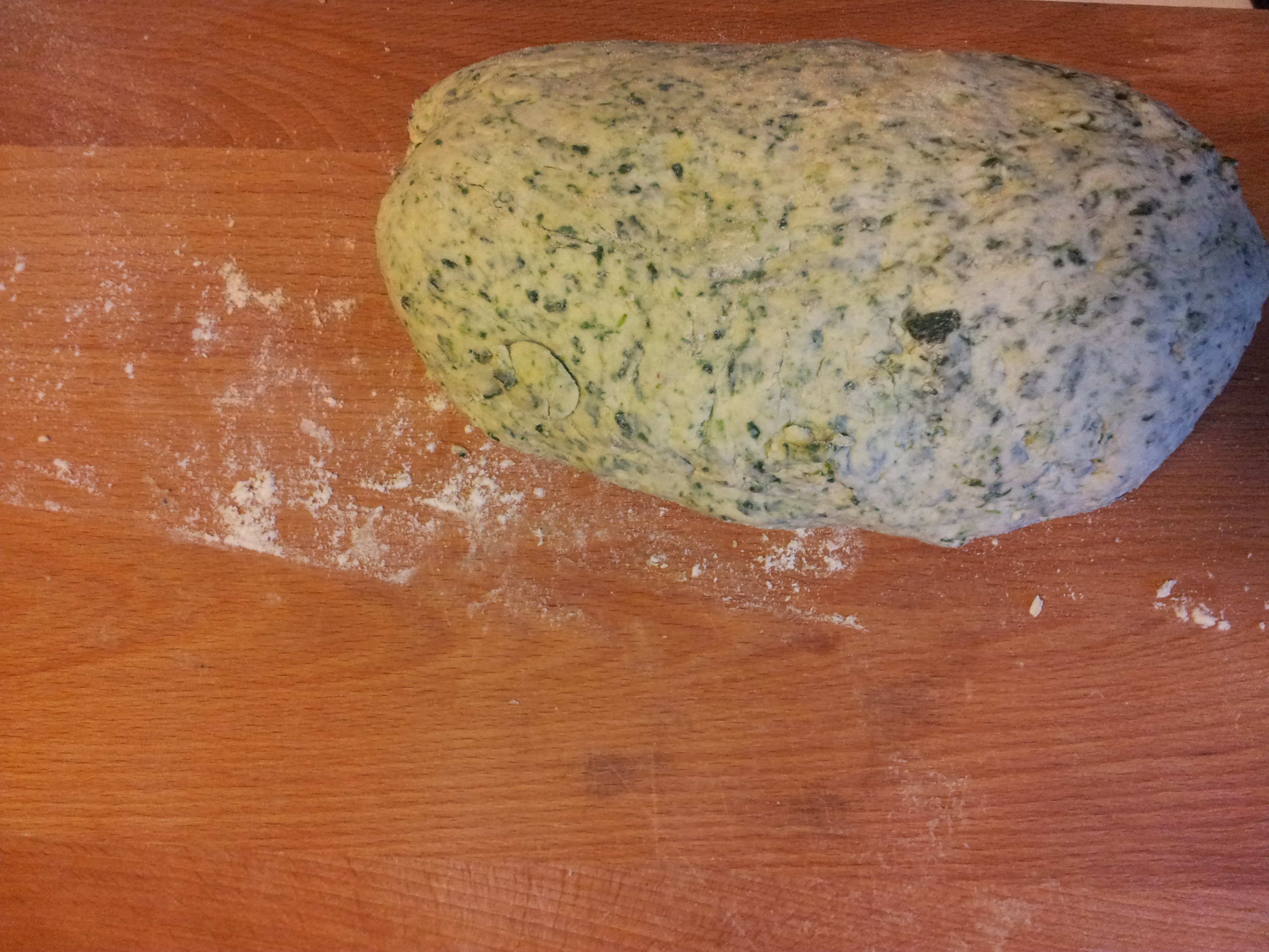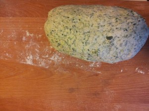 • Put the chopped up spinach in a bowl and add the ricotta, parmesan, regular and potato flour, salt, pepper and nutmeg. Mix all and start knead it like a dough for bread until the mix is soft
