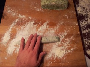 • Make a long sausage from the dough (or if you would have one of those old fashion machines to make croquettes  to make the sausages from the dough)