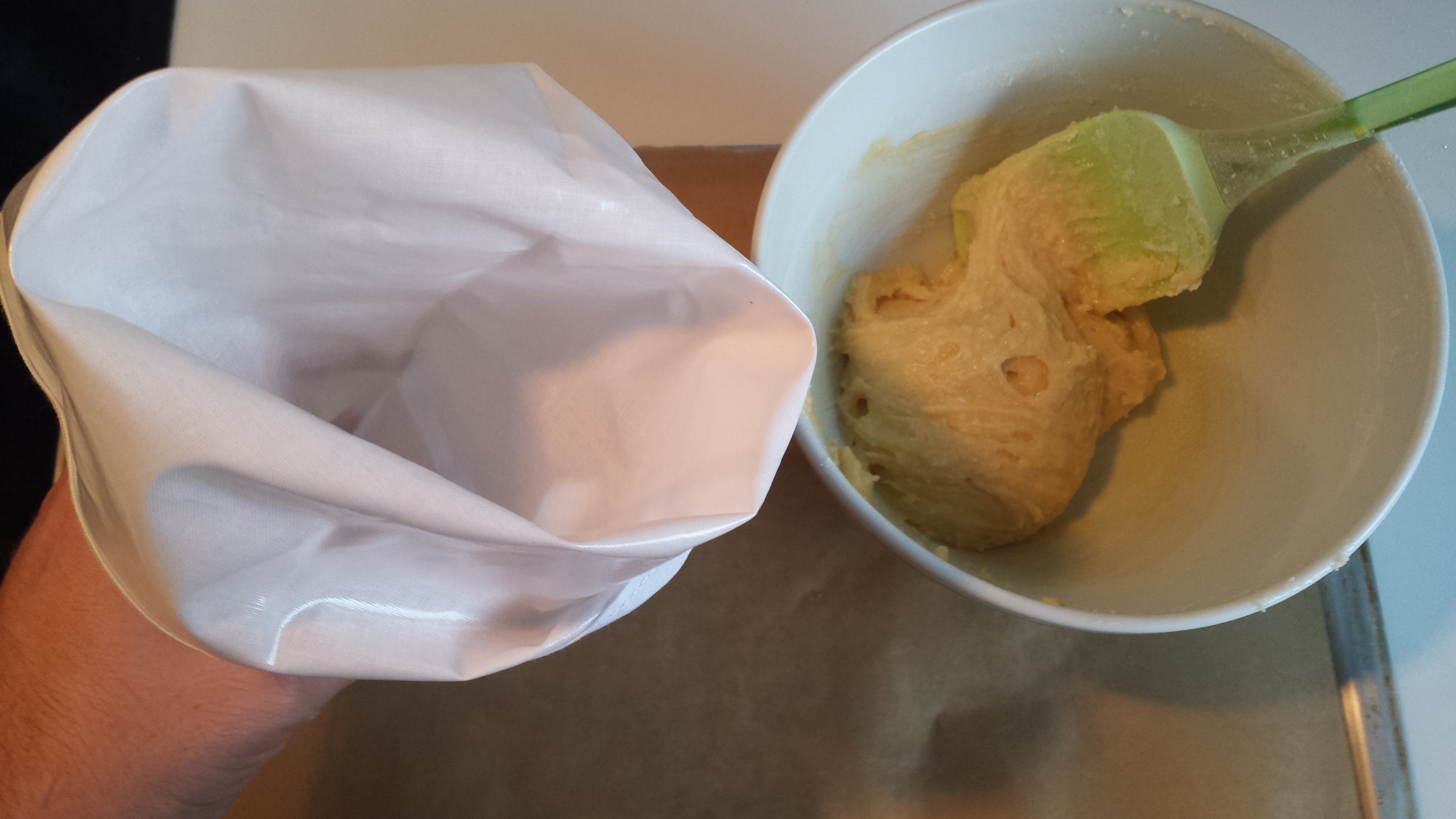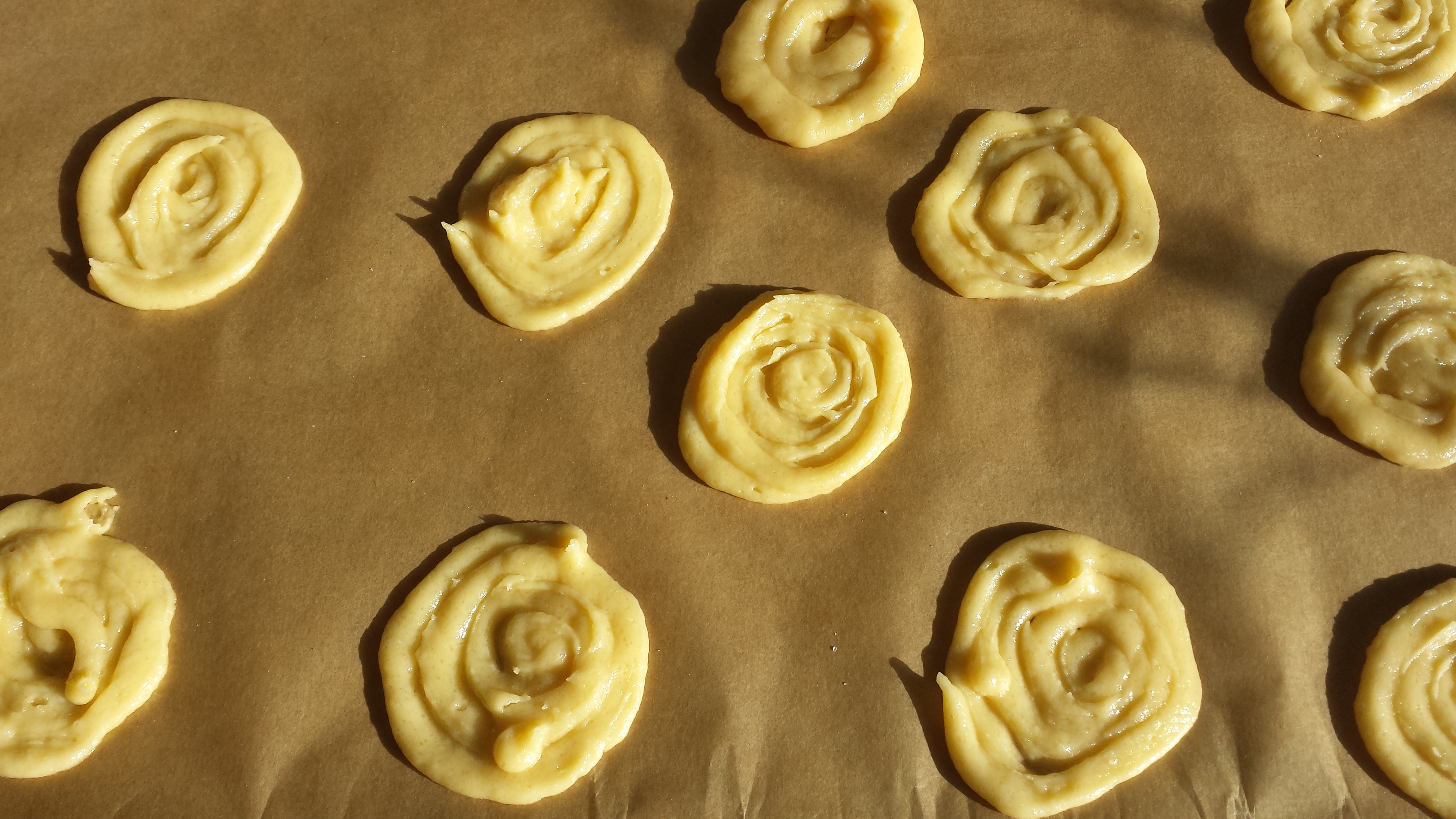 - Take a baking tray with baking paper on it and use the piping bag to make nice rounds (see picture below). You can choose the size you prefer, but I prefer making them smaller (this way I can eat more)