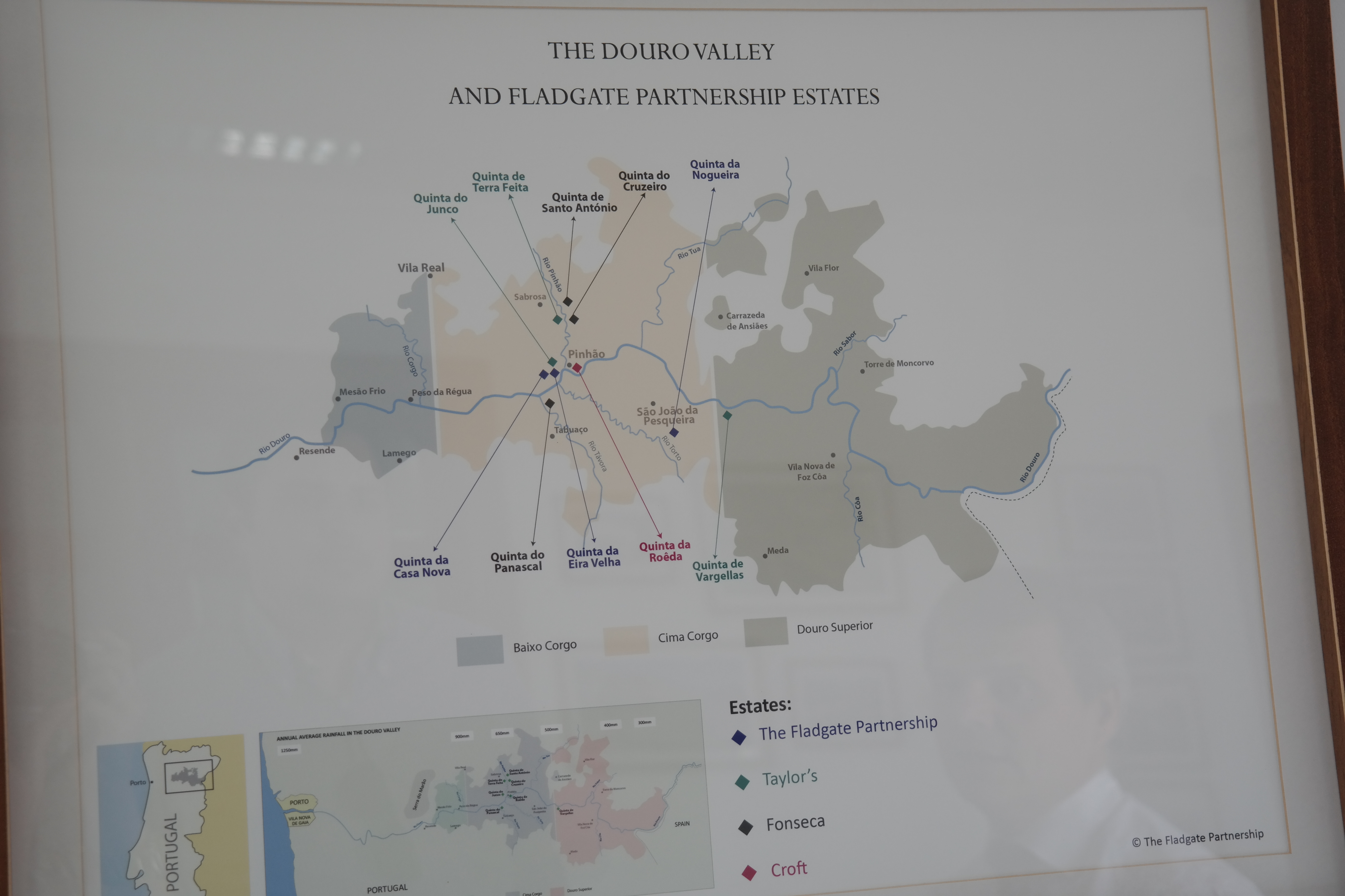 The tour around the Lodge was nice, but tasting the finished product is even nicer (also if you do it in company of a real port specialist like Luis Carneiro). As I might have already told, is that Taylor’s Port house is part of a group of Port 3 port houses: Taylor’s, Fonseca & Croft. These 3 together are aka the Fladgate Partnership :-). Which made the tasting better as we tasted all Port from all 3 estates. This tasting taught us that although they all belong to 1 group, each one still has their own identity, tasts and uniqueness. This is first of all  because of the location of each estate and grapes (see on map below), as the altitude, north/south location, types of grapes, etc… will have a big influence on the finished product.