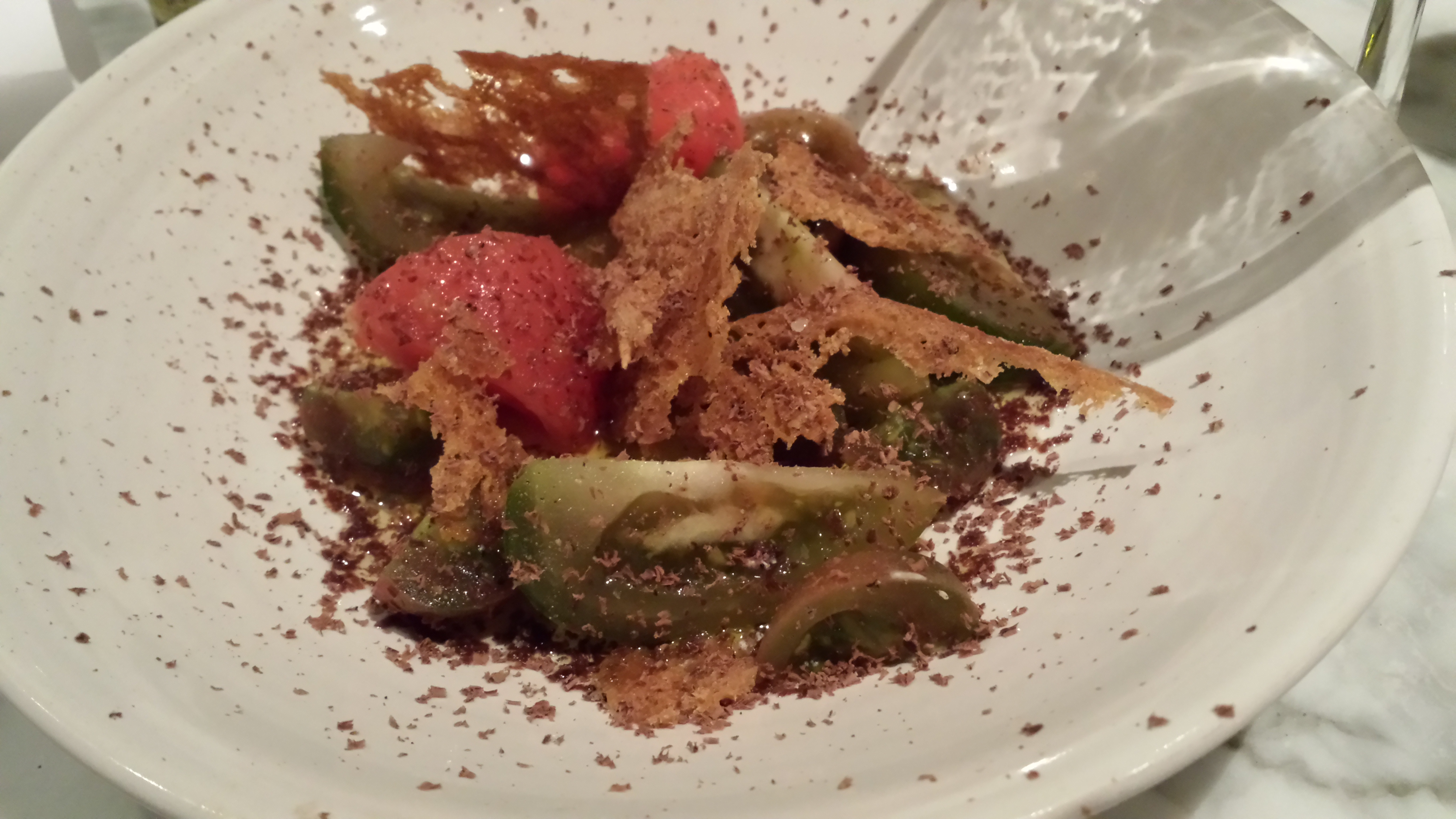 As we were all greedy people we (not only me) choose to take some extra appetizers where fresh vegetables play a lead role. Normally a plate of appetizers is enough for 2 people. I do advice you to take “Tomatoes with black chocolate” as those were some of the best tomatoes ever!! They had so much more flavor than the regular tomatoes you buy!! Not sure though if they were from his own garden or if they came from a farmer?? Please feast your eyes on our appetizers (scroll over the picture to know what it was) I was also a big fan of the Farm egg with black summer truffle. I didn’t try the figs with goat cheese as I’m not really crazy about goat cheese … but my friends ordered 2 plates of it so I guess they liked it.