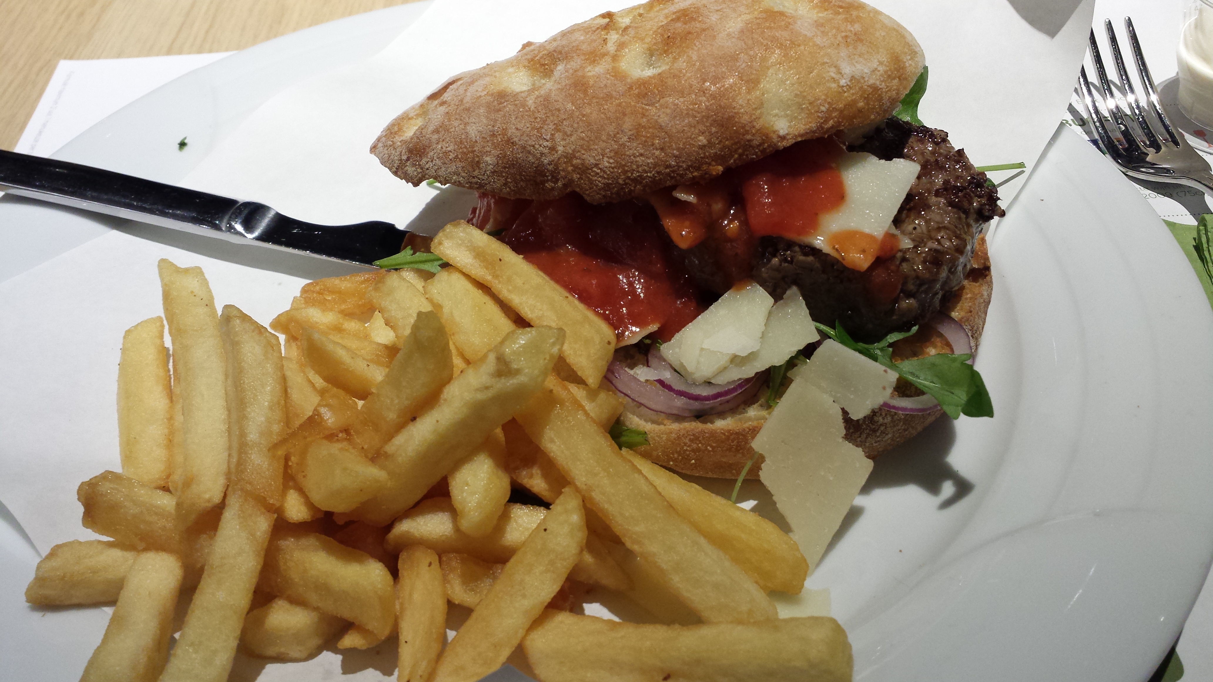 My wife and I decided to take the Enjoyer formula. I was surprised though with the variety of dishes going from burgers to spare ribs to kangaroo filet to codfish, etc… to even vegetarian dishes. They have something for everybody. The starters and desserts are to be taken by yourself from the buffet, the main course you order and it prepared in the kitchen. My wife had the salmon ‘en croute’ with bearnaise sauce and french fries as main menu. I had the Gourmand burger, but like in every other restaurant it was a tough decision to make as I saw lots of dishes I wanted to try… but for some reason greasiness always wins 🙂