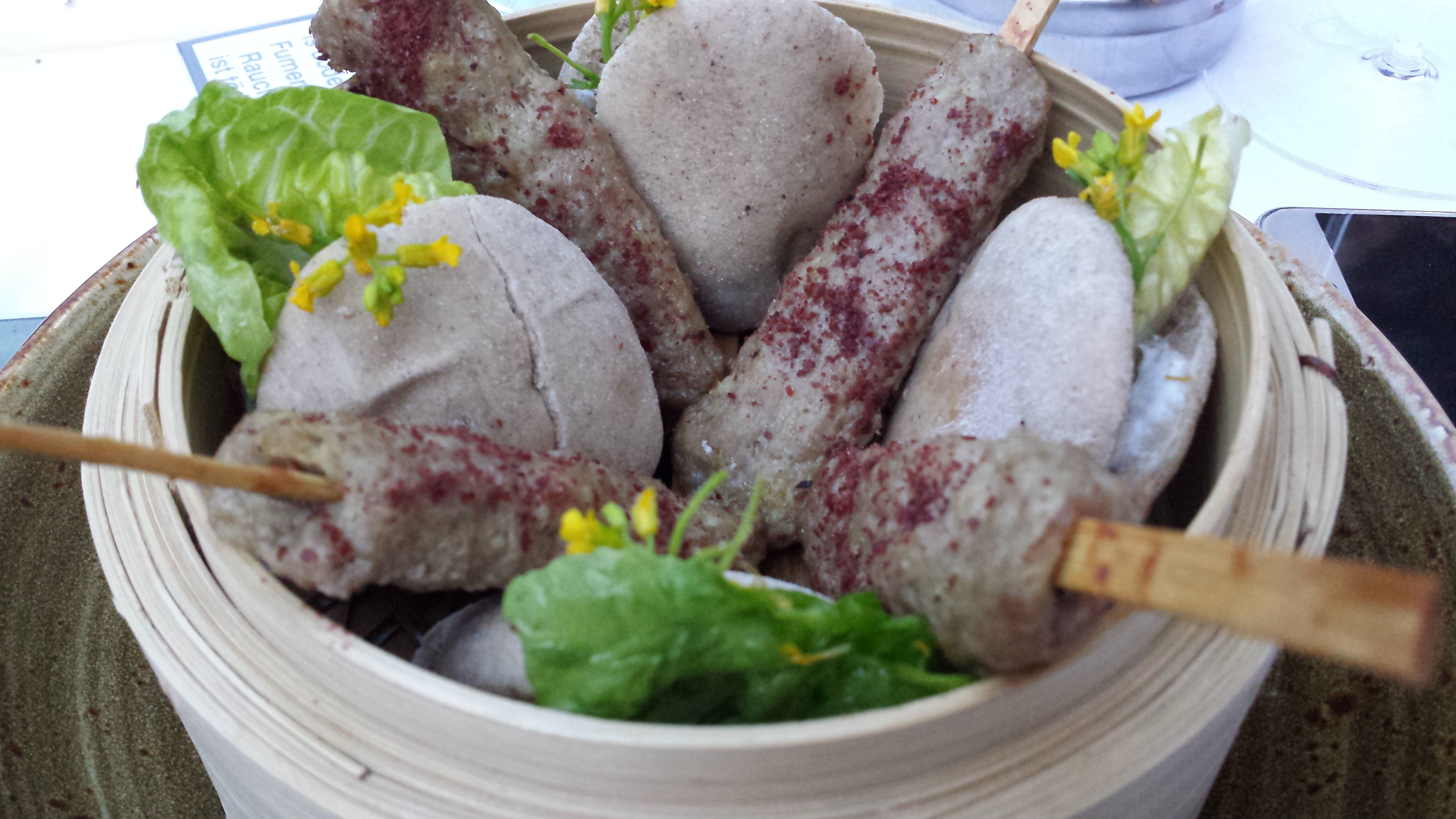 I do like the concept of the fingerfood, which is comparable with tapas you have in Spain. What I liked about Divin’s fingerfood is that you saw influences from all over the Mediterranean that got overlapped with Middle eastern or better Iranian influences (as that is where Sepideh is from) resulting in summer on a plate (and served in a refined way). Maybe it would be easier to tell what fingerfood we didn’t take as we took 90% of the menu 😉 no no, just kidding. The first fingerfood dish was an Iranian wrap with dates, basil and feta (but the Iranian version of Feta). If a non-cheese lover (especially goat or sheep cheeses) like me liked it I mustn’t say more, do I? It is true that the dates in it made a bit sweeter (typical Middle eastern) and maybe that’s what made me love it??