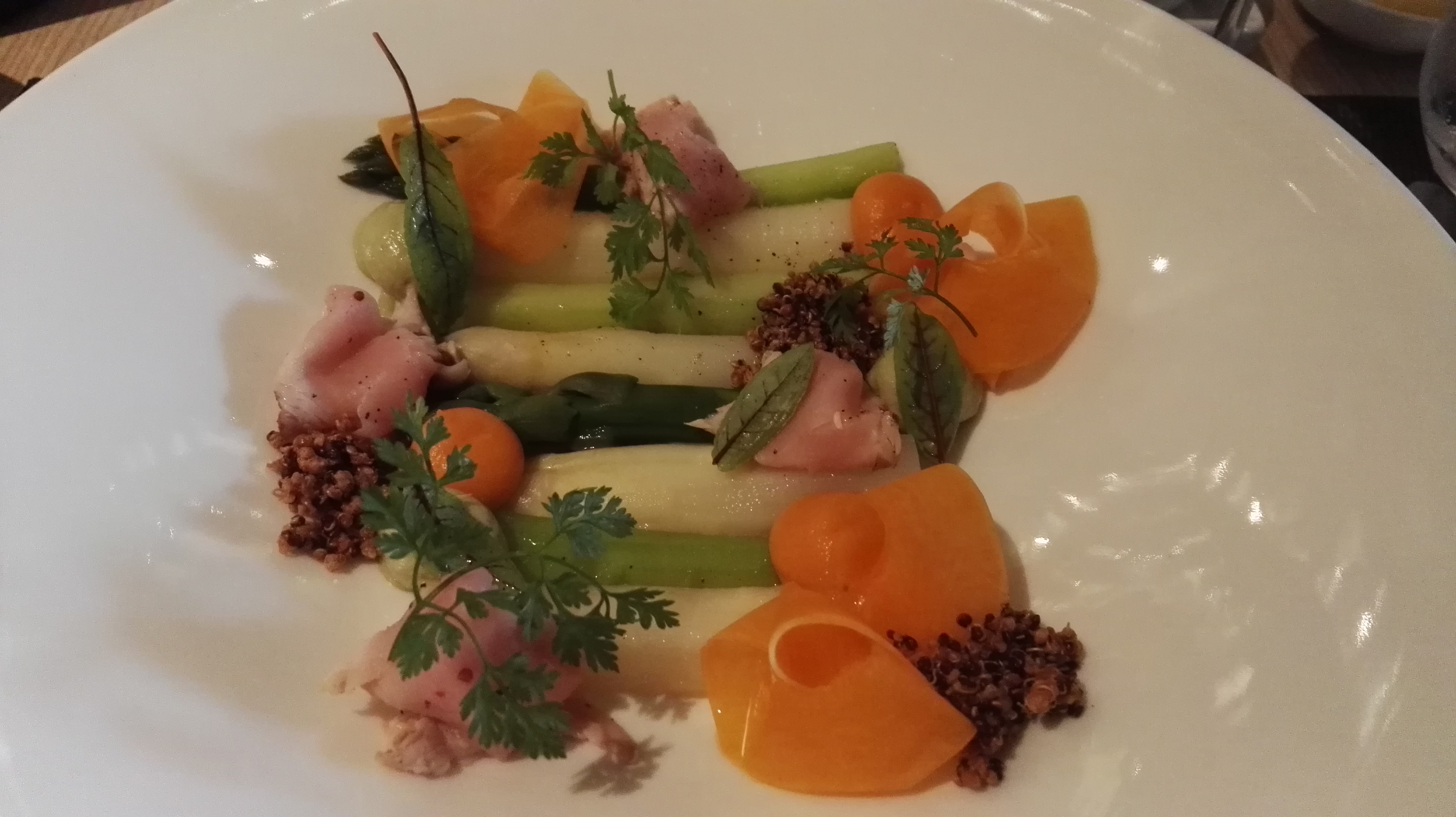 The First dish from our menu was a revisited version of ‘vitello tonnato’. Tuna sauce combined veal, asparagus and roasted butternut. For the wine we started just outside of the traditional Burgundy (Côteaux Bourguign) region with a 2015 Sacy wine 🙂 (Sacy as in the grapes, not the word sassy 🙂 ) made at the Domaine Gueguen. The Sacy grape is a grape ripens early, and produces light-colored wines low in acid and alcohol. A grape that had almost disappeared… if you found it was mostly in a blend from Crémant de Bourgogne. In the nose it does remind a bit of Sauvignon… but in the mouth it is fresher and les “full” or aromatic, but a very nice match with the delicate flavors of the dish.