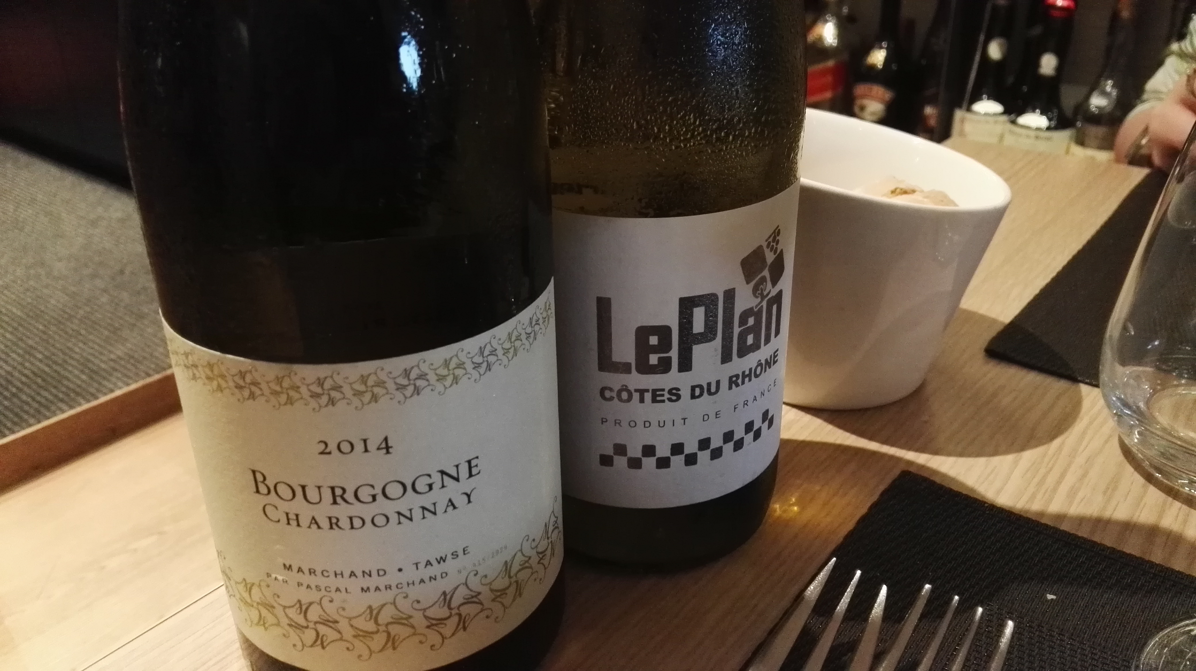 Catfish with white cabbage, cockles and fresh herbs…for this dish Kris had foreseen some “spielerei”: 2 glasses of wine and for me to find out which wines it were… n°1 didn’t tell me anything as it was pretty closed at the first sniff. N°2 was familiar, but as always from where do I remember it?? My first tip was that they were both from the same country, but from a different part of that country 🙂 🙂 After a while Kris finally pulled me out of my misery and revealed the wines… Both French, the first one a 2014 Grenach made by the Le Plan estate from the Côtes du Rhône regoin and the second a 2014 Chardonnay by Pascal Marchand from Burgundy.