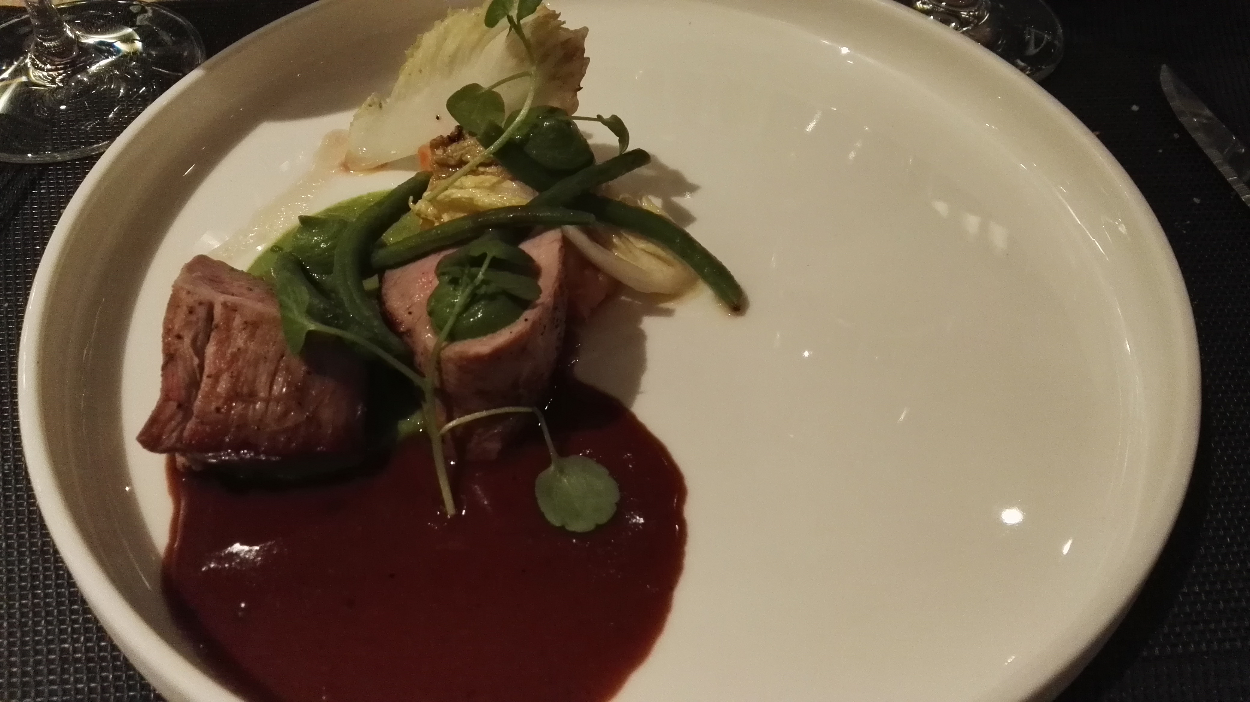 Next the Duroc porc belly with brioche, mushrooms and radicchio…This dish was without doubt given to make me crave for the dish that followed which was a very succulent piece Solomillo “Duroc” meat perfectly cooked and still waters my mouth just by thinking of it. For these dishes some Italian wines seemed to do the trick 🙂 The first a 2013 Refosco from the Terre di Ger (Friuli Region) and the second wine a 2007 Guidalberto (red Tuscan) from the Tenuta San Guido (better known as the winery that makes Sassicaia – one of the Super Tuscans). Although The Guidalberto was a very gentle , delicate and tannic wine that I usually prefer drinking, I did prefer the Refosco with the Solomillo meat… In general a Refosco is quite powerful and tannic, with a deep violet color and a slight bitterness and mostly gets blended with a merlot to soften it. But in this case the 100% Refosco is actually fruitier/juicier and a nice marriage with the dish.