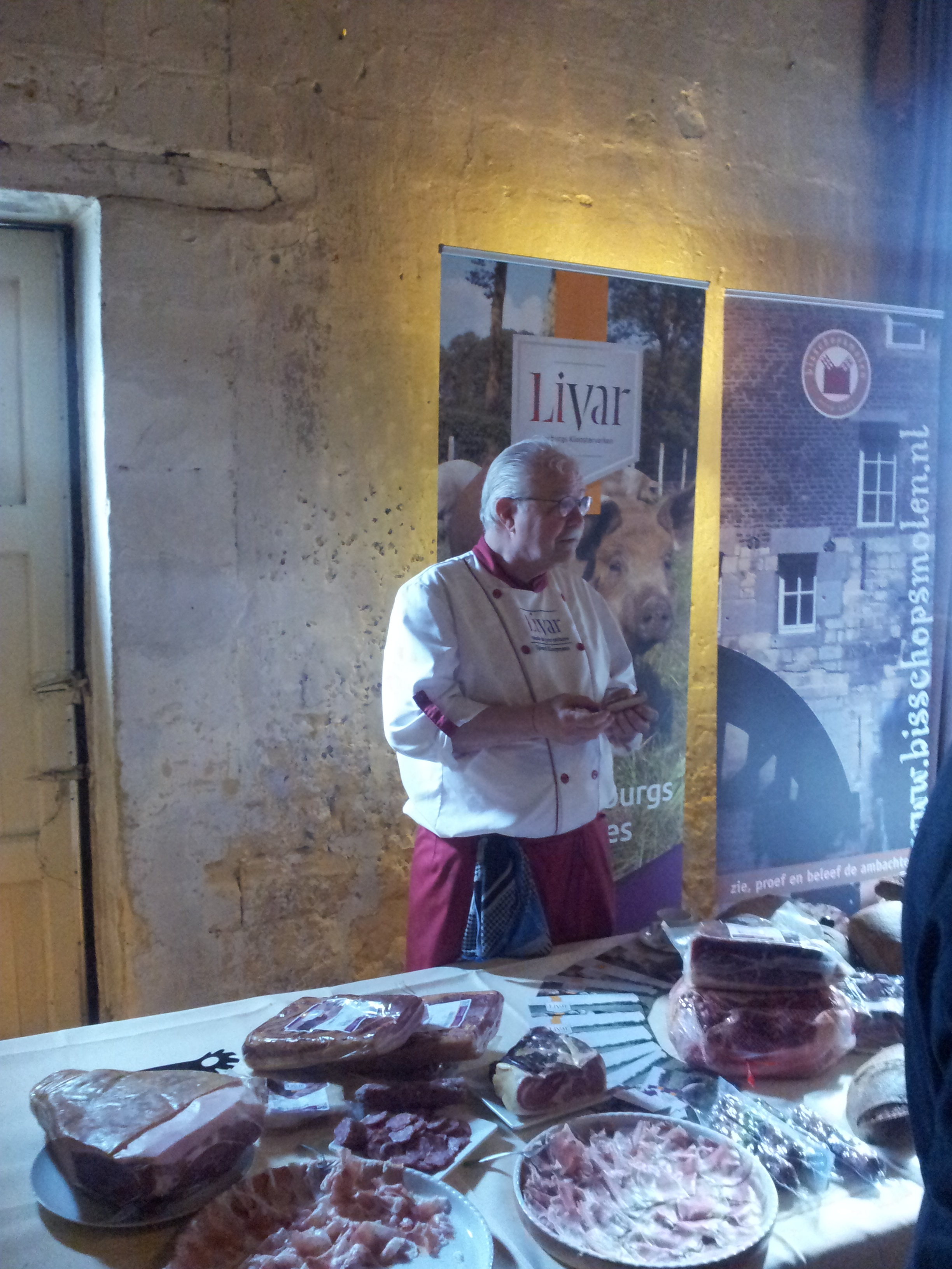 At this “event” or maybe meeting is better word, they had also invited some local culinary craftsmen (winemakers, cheese makers, etc…). I arrived at 10 a.m. so I didn’t feel like trying the beer or wine yet (I just felt wrong) although there are some really good wines in these regions. Something that did catch my attention from the moment I walked in was the ham’s, that is a big weakness of mine I love ham’s both cooked as dry-cured ham (like Parmaham and Pata negra). The “LIVAR” booth was one that immediately got my attention. Livar is actually a ‘pig’ farmer that besides selling the “regular” meat of his pigs also makes some delightful hams!! From the moment you put a piece of that ham in your mouth it immediately melts like butter. Livar has 3 nominations of their ham (from the same kind of pig) the first “Livarsijnk” is dried and aged in the headquarter near Maastricht, the second part gets dried and ages in Spain “Jamon de la Sierra” and the third part “Proscuitto di Monastero” gets dries and aged in Italy near Parma . With the last two as my favorit ones, not that the Livarsijnk wasn’t good, but the other two just had that flavor I love! (They are aged longer). What makes the difference between Livar ham and other hams you’ll find around is the fact that the Livar pigs’ meadow doesn’t have a fence and they get fed things like nuts, etc… I can really recommend trying this ham and/or even visiting Livar whenever you are near Maastricht. I’m a fan!